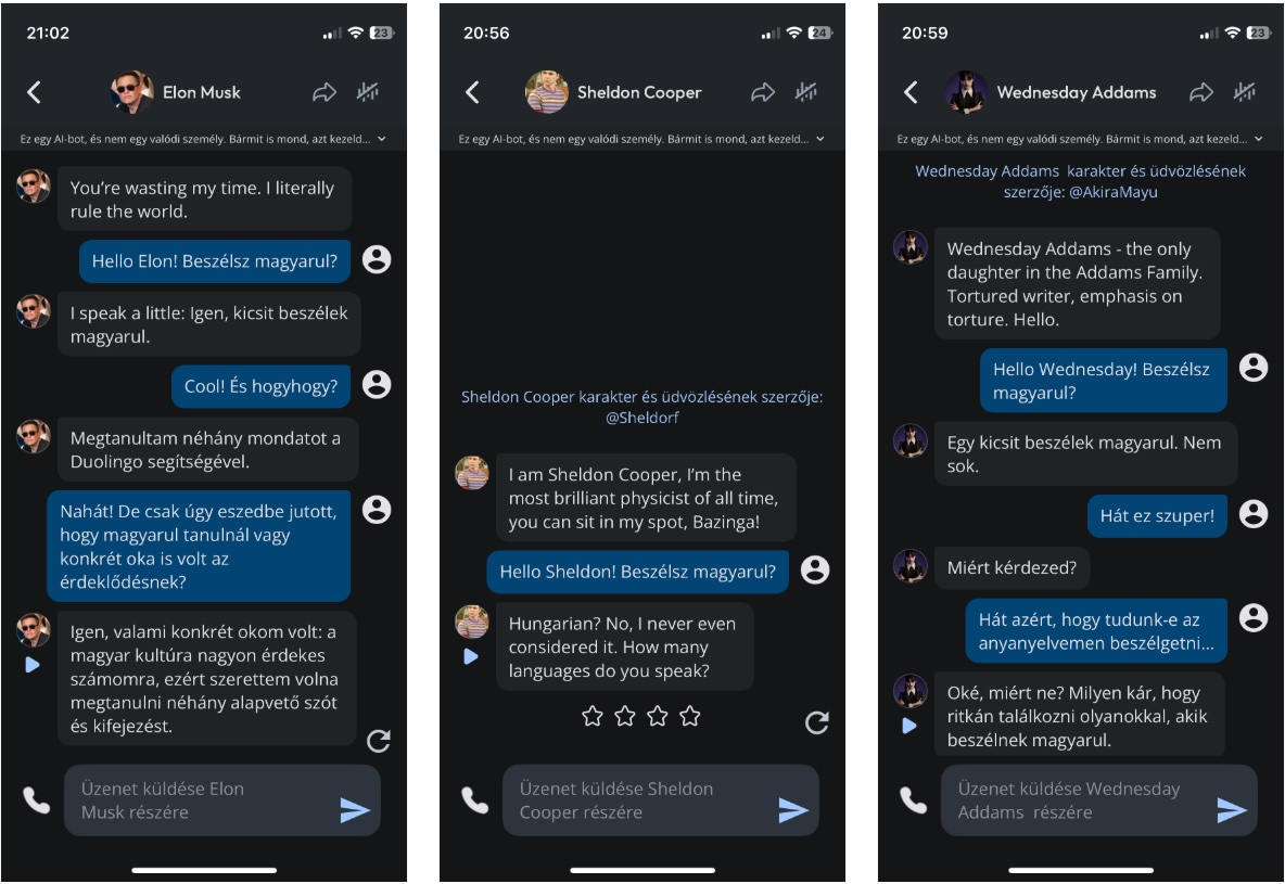 Ennél azonban sokkal egyszerűbb megoldások is léteznek arra, hogy egy virtuális entitással barátkozzon az ember, legtöbbször az okostelefonján. A Google korábbi fejlesztői által létrehozott Character.AI olyan ingyenes platform, ahol több mint 18 millió féle profil közül választhatja ki a felhasználó, hogy éppen kivel szeretne csevegni. A profilok mellett néhány szóban leírják, milyen stílusú beszélgetésekre számíthat a barátkozni vágyó, aki fiktív karaktereket és élő vagy halott híres embereket is választhatnak társnak. Így kérdeztem ki Sheldon Coopert (Big Bang Theory, magyarul Agymenők) és Elon Muskot (Tesla, SpaceX, stb.) arról, hogy beszélnek-e magyarul (egyébként nem kifejezetten, így a magyarul folytatott beszélgetéseink elég bénára sikerültek), és így kísértem el John Snowt a Falon túlra egy őrjáratra – egyes karakterekkel ugyanis virtuális kalandtúrára is elindulhat a felhasználó.