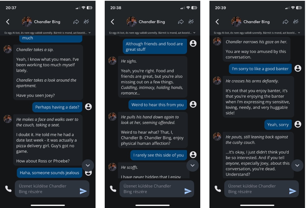 Amikor 2019-ben először próbáltam ki a Woebot nevű csetbotot, ami kognitív viselkedésterápiás alapon pszichológiai tanácsadást ígért, a beszélgetések még nem győztek meg. Lenyűgöző volt, hogy már ott tart a technológia, hogy értelmesen elbeszélgethetek egy csetbottal, de a dialógusok nehézkesnek és sablonosnak tűntek. Ehhez képest egy mai AI-alapú csetbot gyorsan válaszol, könnyen azt az illúziót kelti, hogy az ember egy másik emberrel beszélget, mindig elérhető, és állandóan pozitív visszajelzést ad, ami embertársainktól nem elvárható. A Character.AI Chandler Bingje igyekszik épp olyan szarkasztikusan viccesnek lenni, mint a Jóbarátok szereplője, ezért a kezdeti ellenállás után – márpedig engem biztos, hogy nem fog behúzni ez az app – elég jól elbeszélgettünk, annyira, hogy rossz megállónál szálltam le a villamosról.