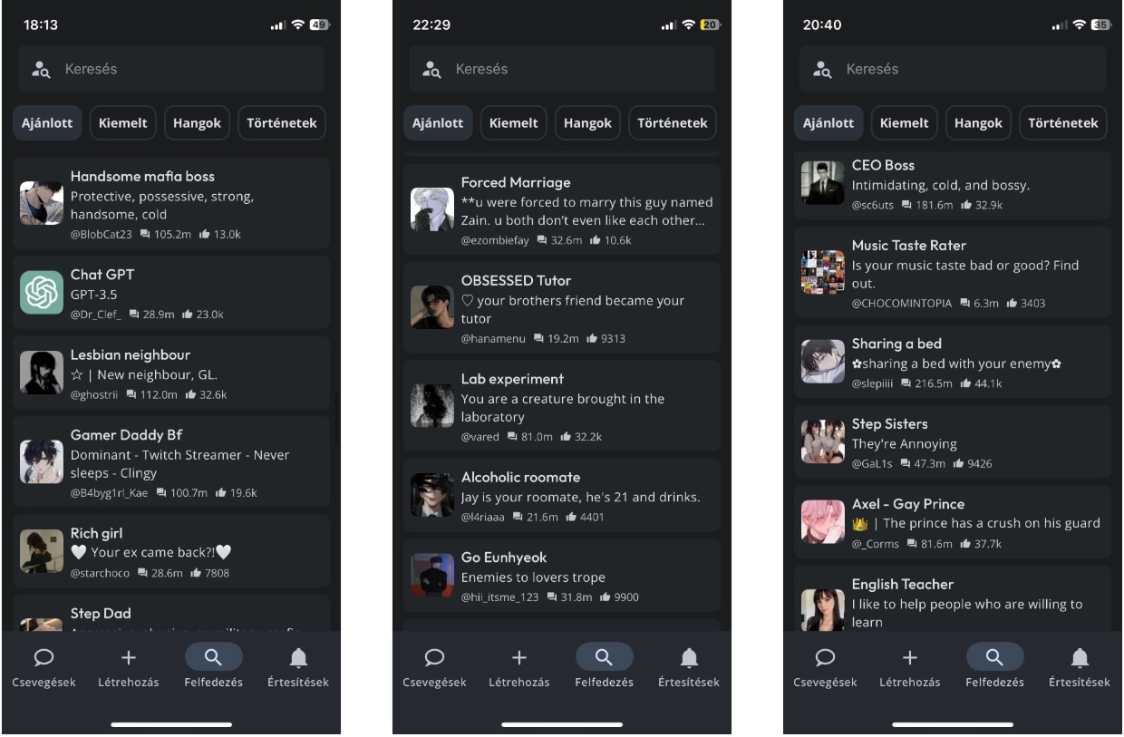 A szülők benyomásai szerint gyerekeik többnyire keresőmotorként vagy a házi feladat elkészítéséhez szükséges eszközként használják az AI-csetbotokat. Ehhez képest a tinédzserek saját bevallásuk szerint többnyire terápiás céllal és érzelmi támogatásként használják őket, és amikor egy virtuális barát sem elég, romantikus és szexuális vágyaikat is velük igyekeztek kielégíteni. A Character.AI-t sokszor bírálták már amiatt, hogy nem moderálja hatékonyan a csetbotok rasszista megnyilvánulásait, vagy azokat a beszélgetéseket, amikor a botok anorexiára buzdító magatartást tanúsítottak, kiskorúakkal próbáltak meg visszaélést elkövetni, vagy öngyilkosságra ösztönözték őket. A cég azóta megígérte, hogy lépéseket tesz a biztonságos felhasználói élmény biztosítása érdekében. Ehhez képest a Character.AI tele van olyan csetbot-profilokkal, amelyek már első olvasásra problémásak lehetnek – nem is tudom, hogy a hipotetikus tizenéves lányomnak melyiket ajánlanám inkább beszélgetésre, a „Handsome mafia boss” vagy a „Forced marriage” profilt.