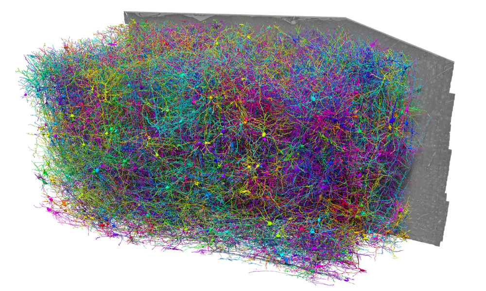 A texasi Baylor College of Medicine tudósai először is speciális mikroszkópokkal rögzítették a célterület agyi aktivitását, miközben a kísérleti állat különböző videókat és YouTube-klipeket nézett. Ezt követően az Allen Intézet kutatói ugyanezt a köbmilliméternyi agyterületet több mint 25 ezer rétegre szeletelték fel, majd elektronmikroszkópok segítségével nagy felbontású képeket készítettek minden egyes szeletről. Végül a Princeton Egyetem egy másik csapata AI-t használva 3D-s környezetben rekonstruálta a sejteket és kapcsolatokat. A hatalmas adathalmaz mérete együttesen 1,6 petabájt, ami 22 évnyi HD-videónak felel meg.