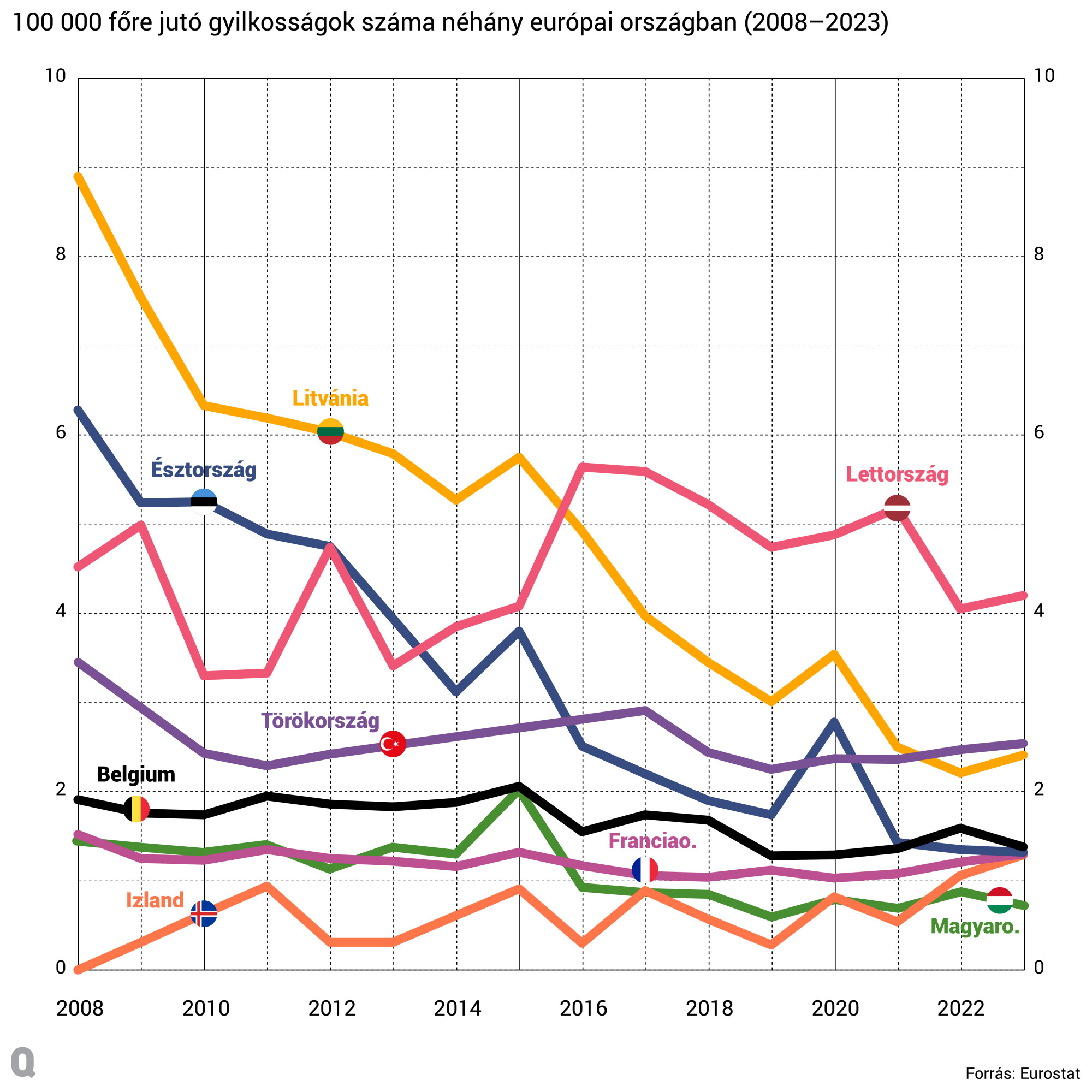 Utoljára 2020-ban, a covid által okozott társadalmi sokkhoz kapcsolódóan néztük meg részletesen a hazai emberölési adatokat. Akkor azt találtuk, hogy a 2010-es évek eleje volt a legrosszabbak e tekintetben, és egészen a karantén elrendeléséig javultak az adatok. Abban a cikkben részletesen bemutattuk az értelmezési nehézségeket is. Nem mindegy, hogy az emberölést akkor regisztrálják, amikor történik, vagy amikor elítélnek érte valakit; kérdés, hogy a több ember sérelmére elkövetett emberölés egynek számít vagy többnek, vagy hogy bekerül-e s statisztikába egy haláleset, ha nem egyértelmű hogy mi okozta. A mostani Eurostat-adatok ezeket a kérdéseket részben zárójelbe teszik, mert az EU statisztikai hivatala igyekszik összevethetővé, egységessé tenni az adatokat.