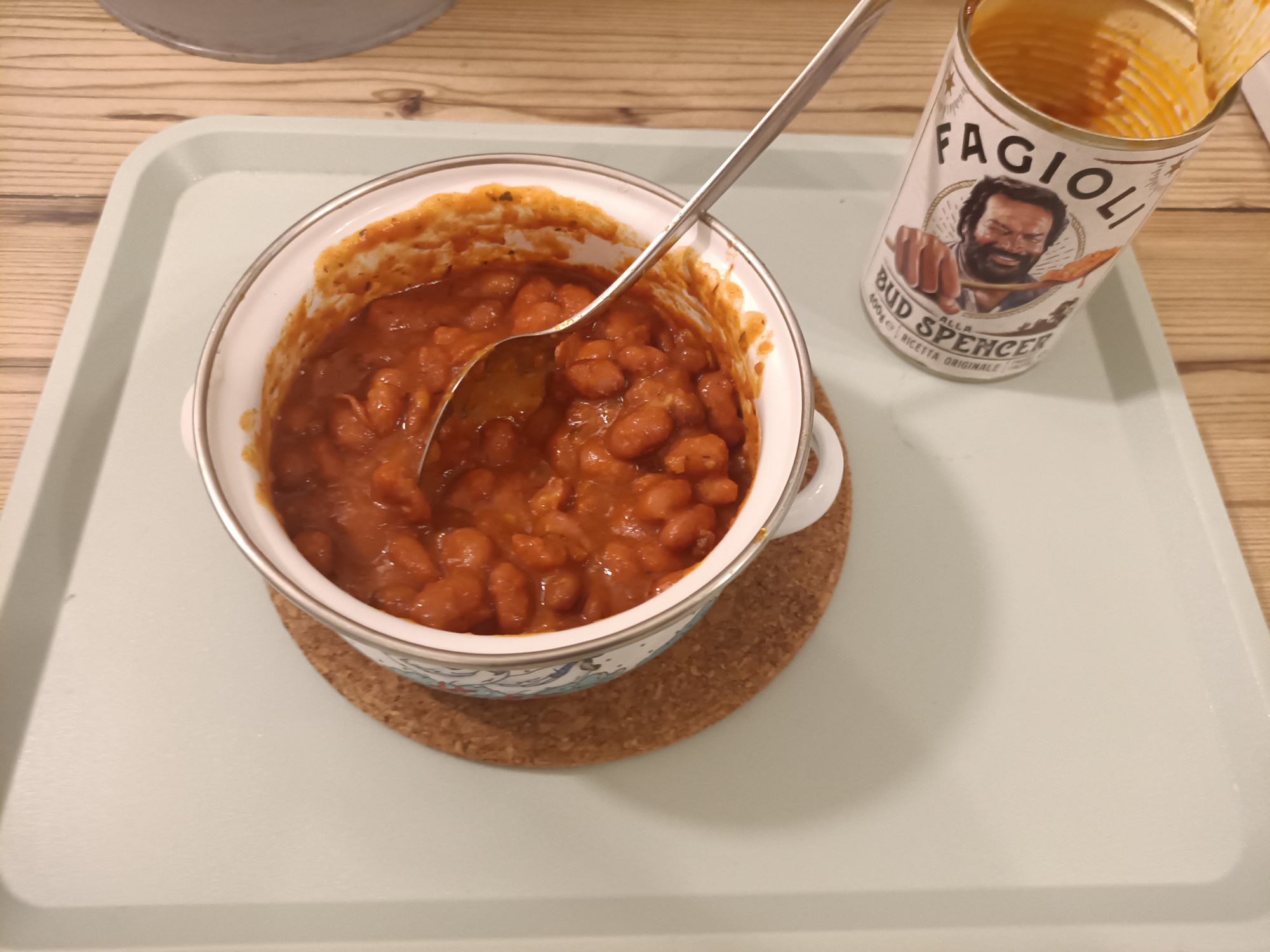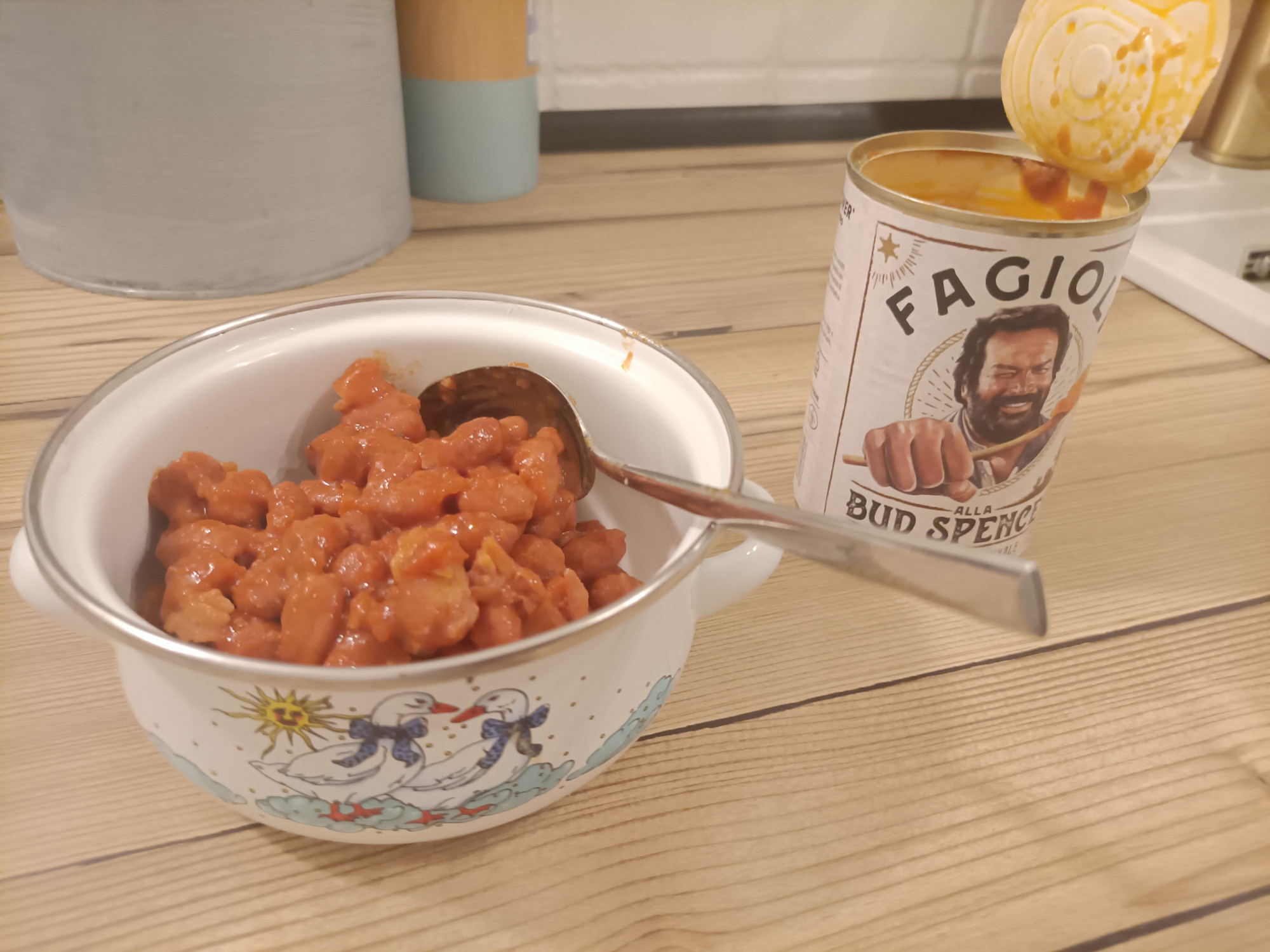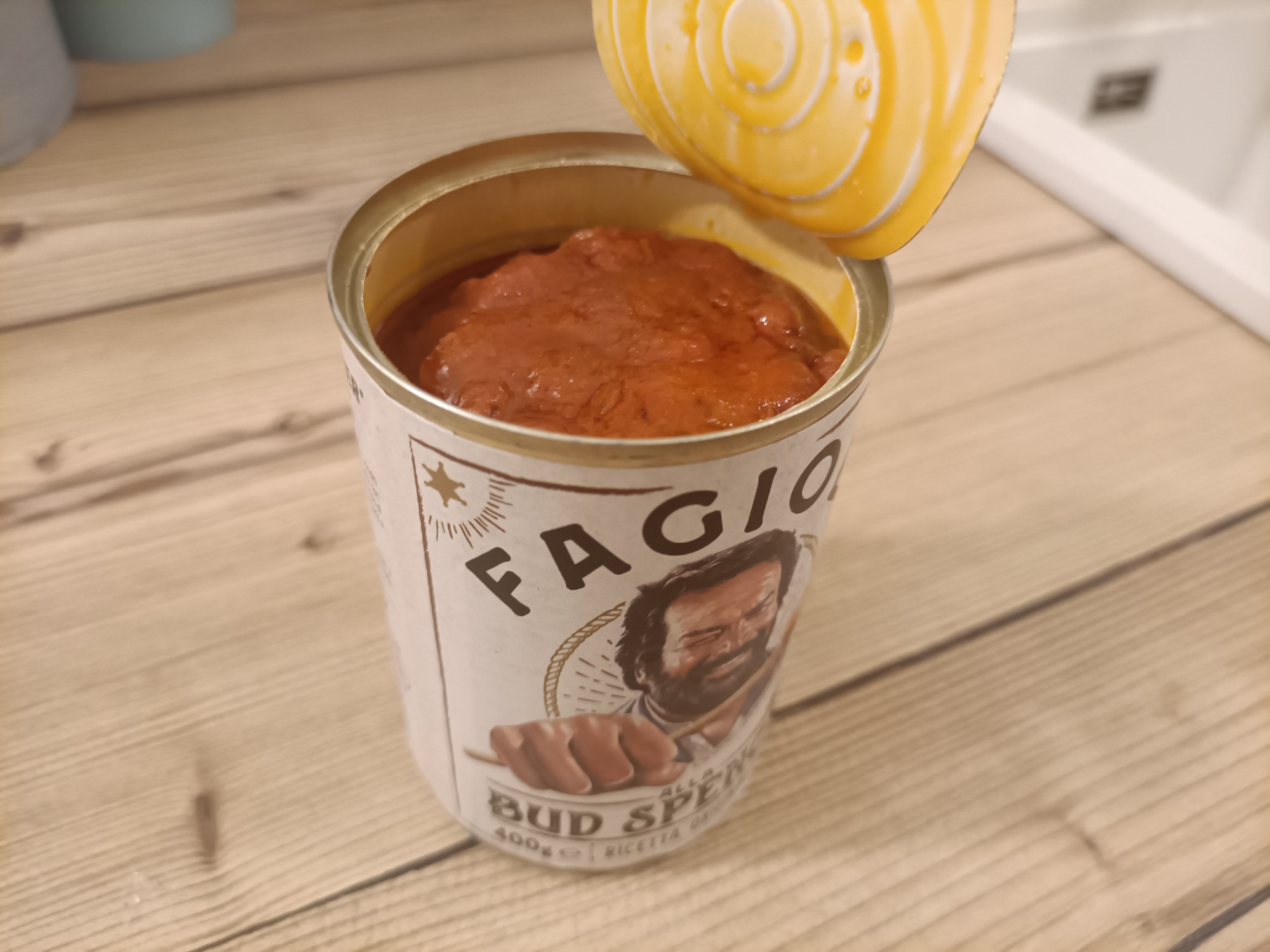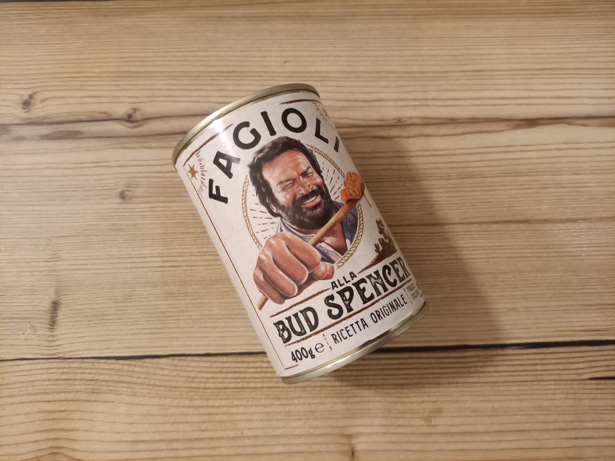 A konzervet Bud Spencer képe díszíti, piemonti borlotti babból, paradicsompépből, hagymából, füstölt szalonnából és fűszerekből áll. A címke tanúsága szerint van még benne fokhagyma, dextróz, fruktóz, cukor, nátrium-aszkorbát, nátrium-nitrit és nátrium-nitrát és víz is. Nem éppen a Michelin-csillagos Széll Tamás hagymásbab-újragondolása, de ettől még lehet jó, és ha elhisszük Giuseppének, hogy az apja jegyzeteire támaszkodott, amikor összeállították a receptet, ez az eredeti változat, ami mindent lebíró erőt és akaratot ad az embernek. Ez a dobozon is rajta van, úgyhogy biztos, hogy igaz.