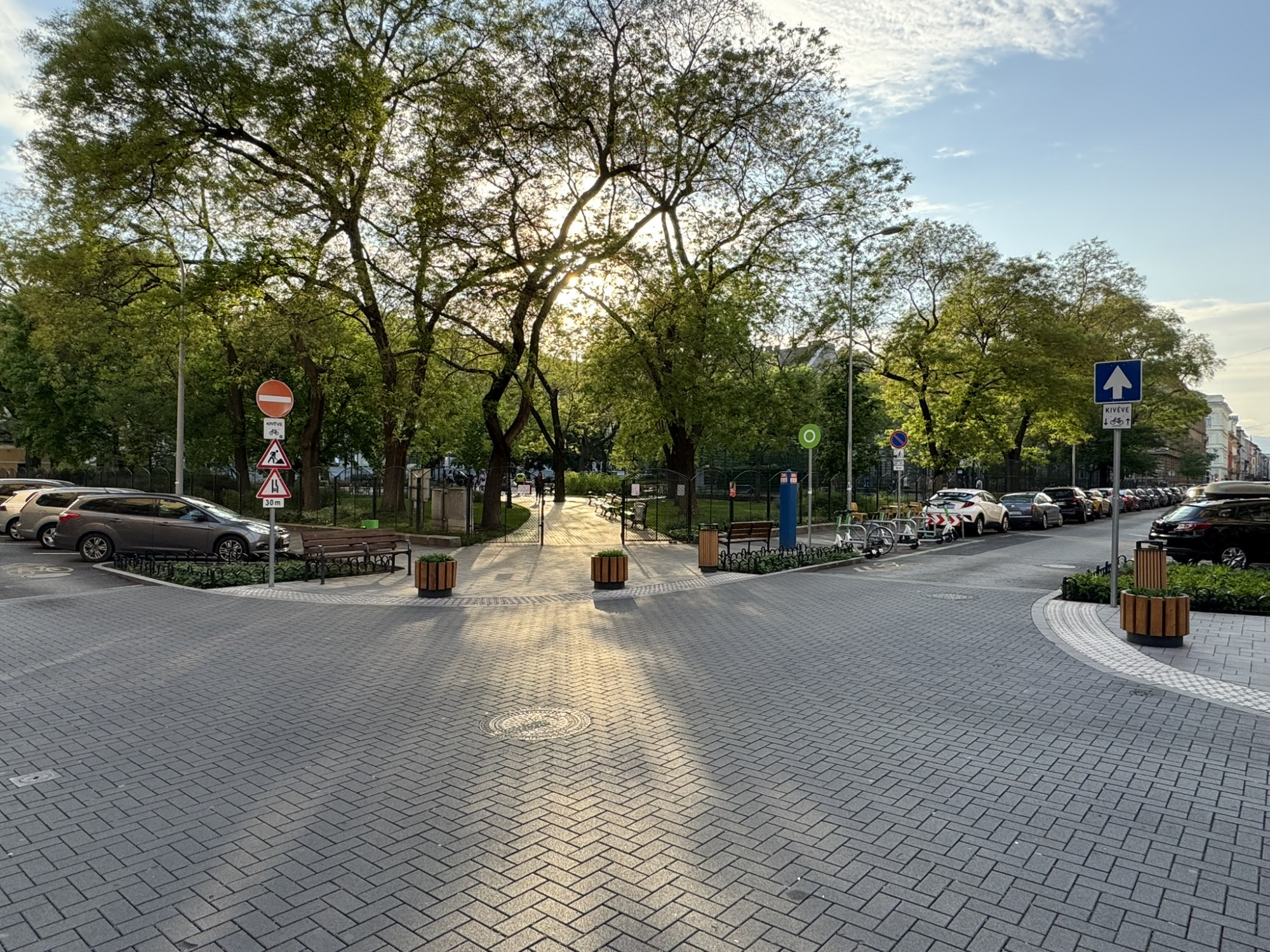 A 9. kerületi Ferenc téren jól működik ez a kapcsolódás. A park több irányból, akadály nélkül megközelíthető, nincs elválasztó kerítés és nincsenek éles váltások a járda, az útburkolat és a központi zöldterület gyalogos felületei között. A tér szervesen kapcsolódik a környék utcáihoz, ahol csillapított a forgalom, széles járdák, fák és padok teszik kényelmessé a közlekedést és a tartózkodást.