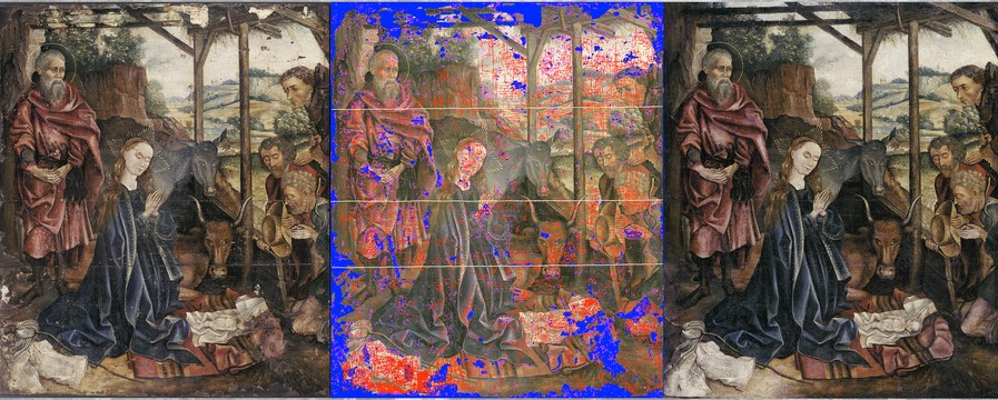 A királyok imádása bibliai jelenetet ábrázoló kép meglehetősen részletgazdag. Jól láthatóan négy panelre oszlik, felületét finom repedések borítják, valamint több ezer apró folt tarkítja, ahol a festék is levált. Kachkine szerint a festmény hagyományos restaurálási technikákkal történő helyreállítása körülbelül 200 órát vett volna igénybe. A szakember először végig szkennelte a festményt, hogy meghatározza a sérült területek méretét, alakját és helyét. Ezen a módon 5612 különálló, javításra szoruló részt azonosított.