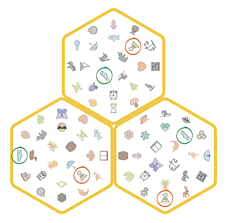 Korábban kitűztük a Dobble kártyajáték általánosítását, amikor nem kettő, hanem három kártyalapon kell keresni a közös szimbólumot. Ilyen típusú általánosításból idő közben egy megvásárolható játék is született, a Møbee, amiről szintén írtunk korábban.