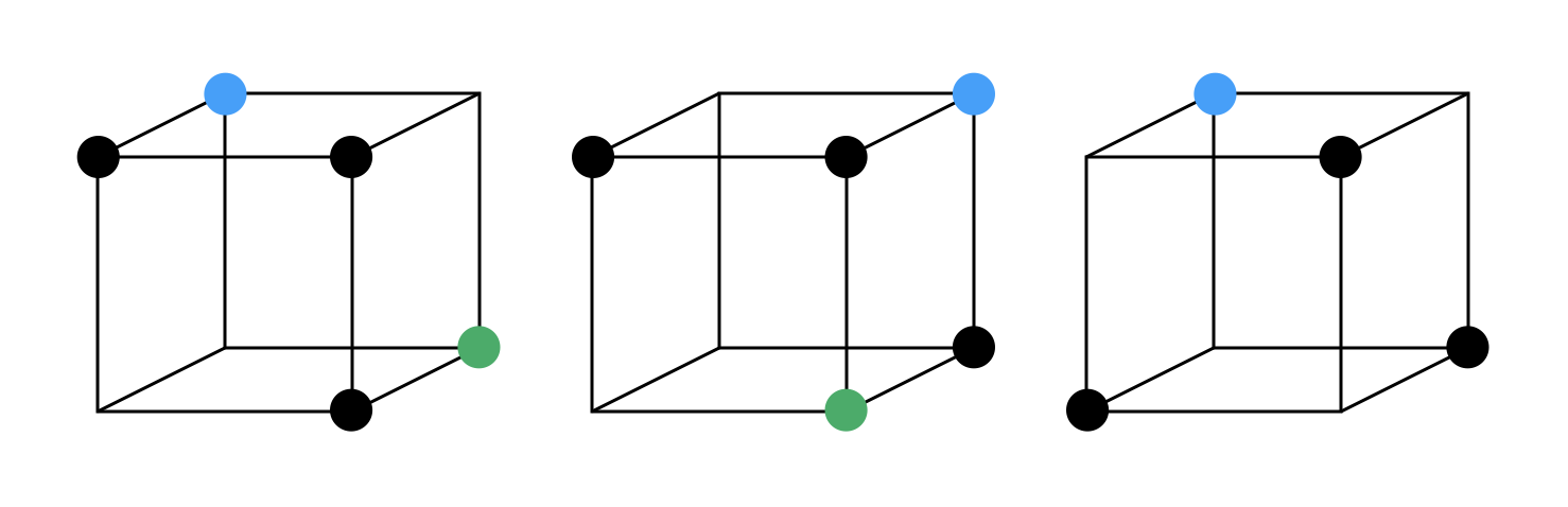 Most nézzük meg, hogy az így konstruált pakli megfelelő-e. Nézzük hányféleképpen választhatunk három lapot, azaz kocka csúcsokat. Tekintettel arra, hogy az egész konstrukciót a kockához, mint szabályos testhez kötöttük, könnyen belátható, hogy a forgásszimmetria miatt elegendő csak az alábbi három eset ellenőrizni, ahol a fekete pöttyök jelölik a kiválasztott csúcsokat.