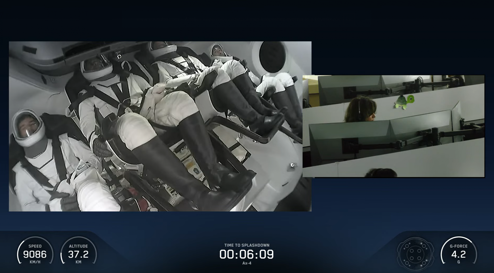 Az ezt megelőző bő egy óra azonban sok izgalmat tartogatott. Először is láthattuk, ahogy 28 ezer km/órás sebességgel belép a légkörbe a Dragon, és több mint 1500 Celsius-fokra felizzik a hővédőpajzsa.