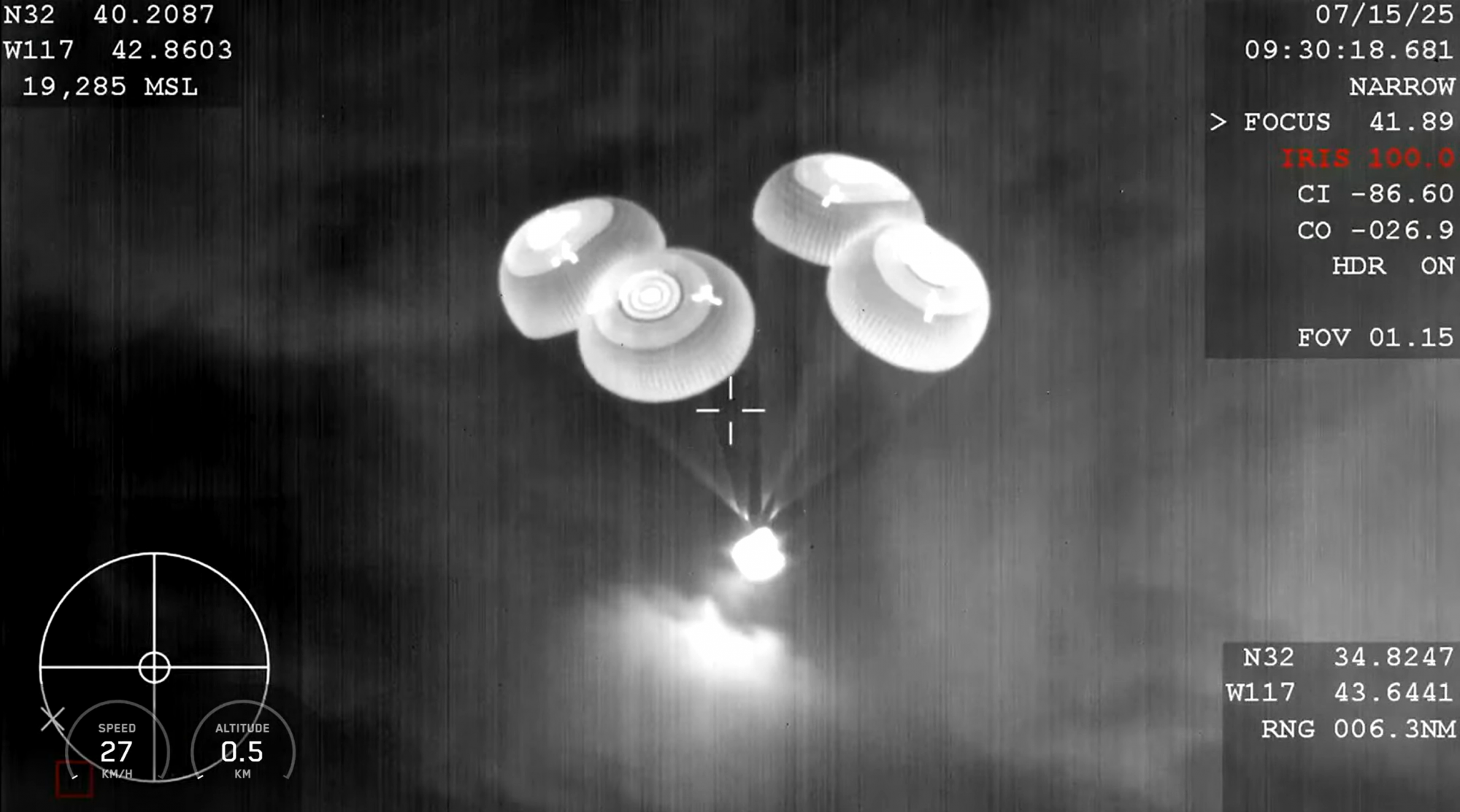 Ezután 5,5 kilométeres magasságban, 11:27-kor kinyíltak az űrkapszula fékezőernyői, majd egy perccel később a főernyők.