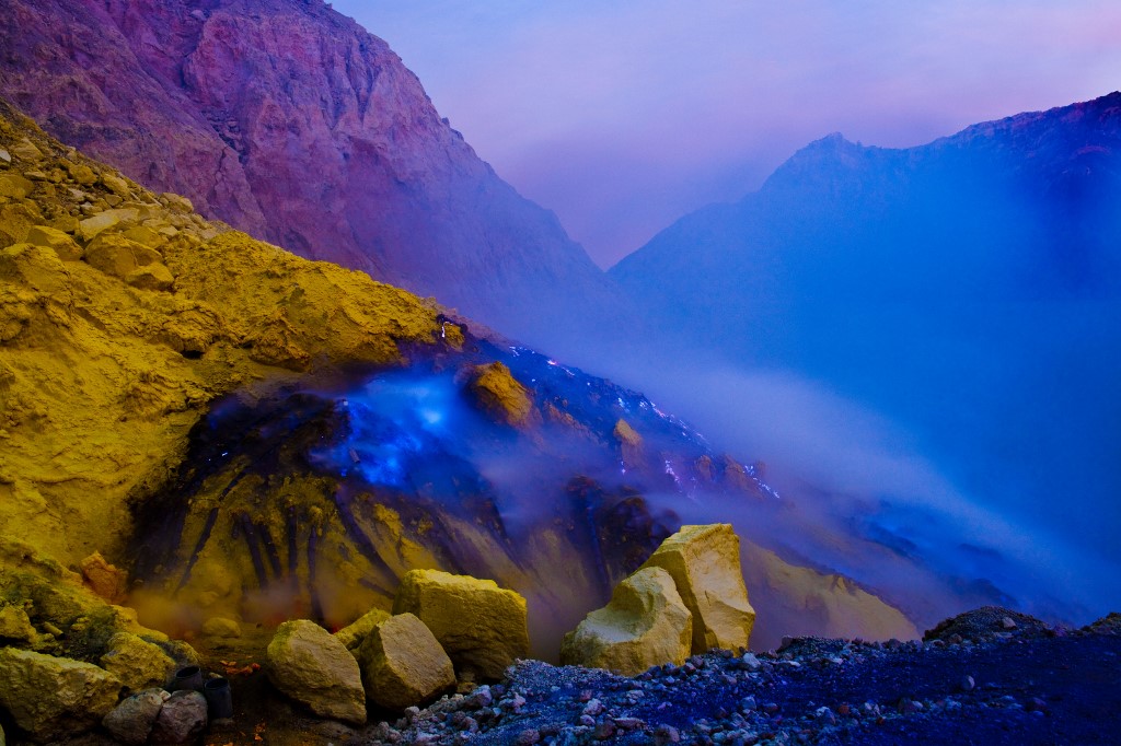 A kén másutt is bőségesen jelen van vulkáni környezetben, de a viszonylag sűrű kitöréseket produkáló Kawah Ijen az egyetlen vulkán a világon, amely rendszeresen kék színű lánggal ég. Ez a szokatlanul nagy kén készleteinek és a hidrotermális rendszere intenzív hőjének köszönhető, amely elérheti a 600 °C-ot is.