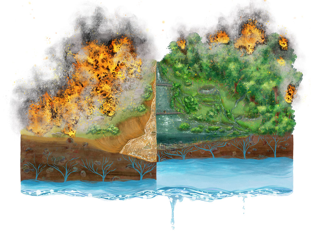 A Brit Columbiai Vadvédelmi Szövetség (BCWF) két éve indított élőhely-helyreállítási programjának egyik deklarált célja a hőhullámok és a csapadék egyenlőtlen eloszlása miatti szárazság okán a mérsékelt övi vegetációban is egyre gyakoribb erdőtüzek kialakulásának megakadályozása, terjedésének korlátozása. A tűzvédelem ugyan alapküldetése a 10 ezer vizes élőhely címen (10,000 Wetlands Project) meghirdetett rekonstrukciós projektnek, de gyakorlatilag ugyanarra az ökológiai srófra jár, mint a magyarországi Vízválasztó Mozgalom szakmai koncepciójában szorgalmazott, a jászkarajenői és marispusztai civil vízőrzők által kicsiben és helyben megvalósított természetközeli aszályvédelem. A lényeg mindkét esetben a víz tájban tartása.