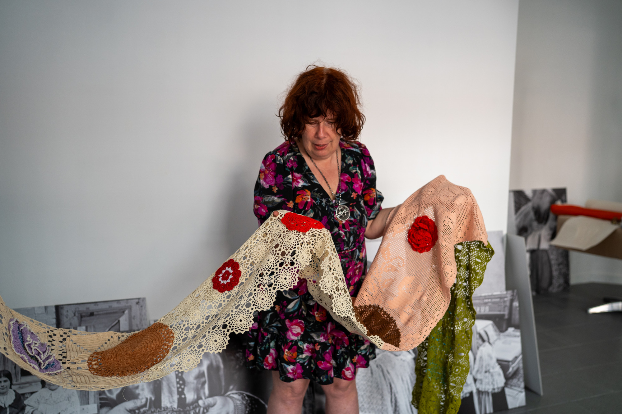 Azonnal összecsődíti a kollégáit, akik felsorakoznak mellette, hogy a horgolt mintákat megnézhessem. Több méternyi csipkét hajtogatnak ki egy műanyag szatyorból, és hol van még a vége! Horgolt virágok, felvarrt csipkeminták díszítik az alkotást: csupa olyan aprócska részlet, ami egyedivé és személyessé teszi, miközben emléket állít a hagyományoknak is. A csipke ugyanis tudatosan választott motívum.