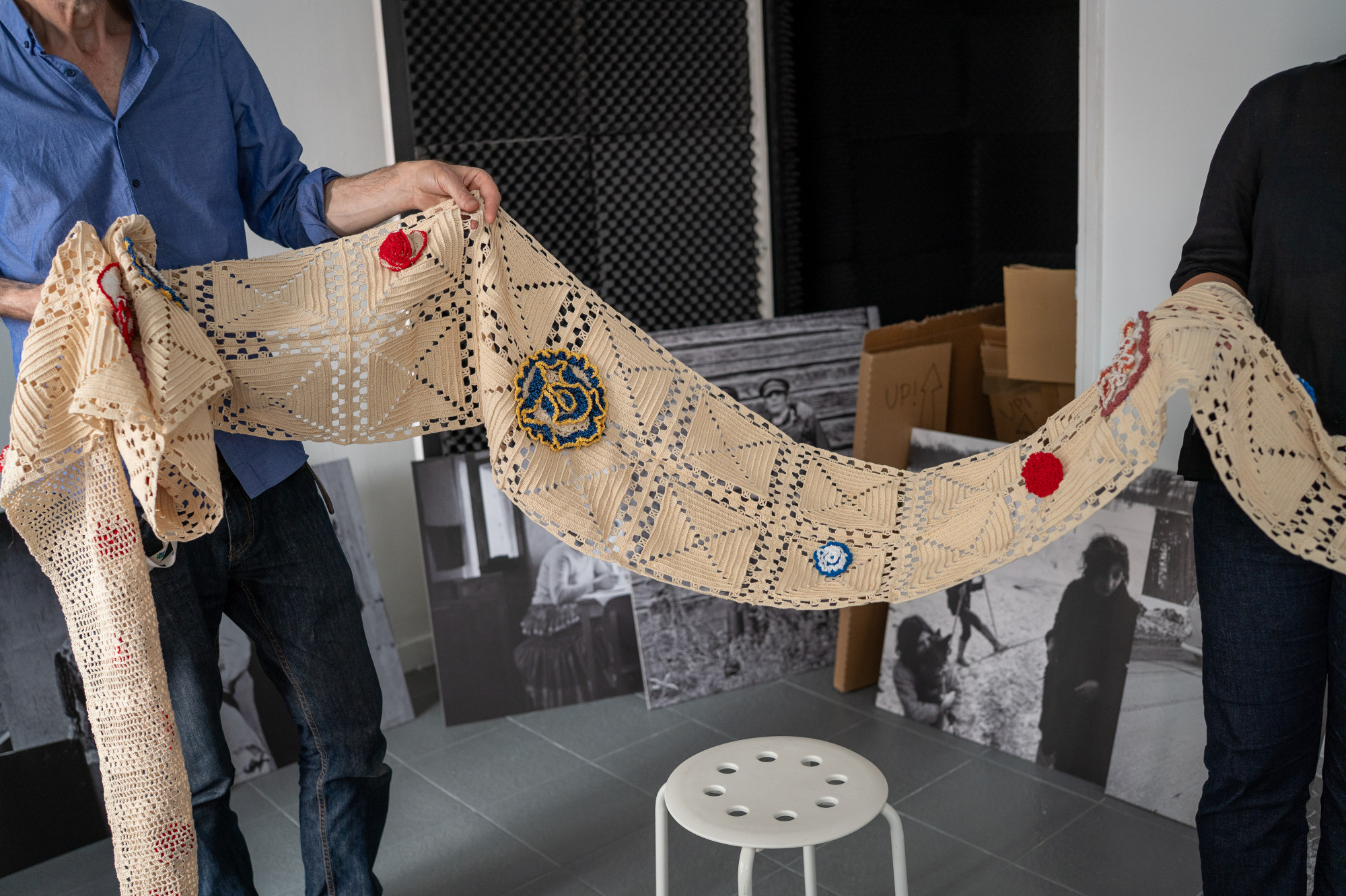 Itt áll előttem ugyanis egy több évtizedes rendezői múlttal rendelkező finn nő, aki lenyűgöző áhítattal beszél a horgolásról. Nem arról, hogy egy sima-egy fordított vagy kétpálcás sorok vannak-e egy nagyikockán, hanem arról a már 45 méter hosszú horgolt munkáról, amit workshopokon gazdagítanak az érdeklődők. Ez gyakorlatilag egy színes kulturális híd, ami összeköti a hagyományokat a jelennel. Most pedig Magyarországon lehet megnézni, megérinteni és akár dolgozni vele.