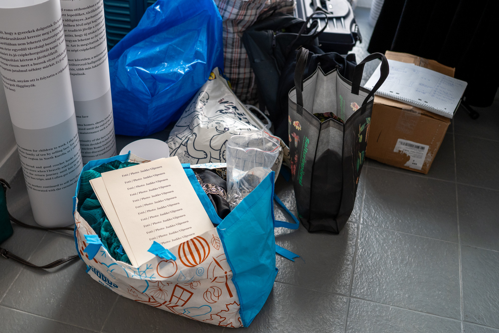 És hogy miért nehéz a csipke? Ezt a kérdést fel se kell tennem, Lillqvist magától mesél róla. A nagy szatyrokra mutat a kiállítótér sarkában: ezekben van a 45 méter hosszú horgolt csipke egy sor más munkával együtt. Ezt pedig tényleg nem könnyű megemelni. Ilyen súlyos darabokat cipeltek magukkal azok a nők is, akik lovak és szekerek híján gyalog járták a falvakat és udvarokat, hogy eladják a csipkéjüket és pénzt keressenek vele.
