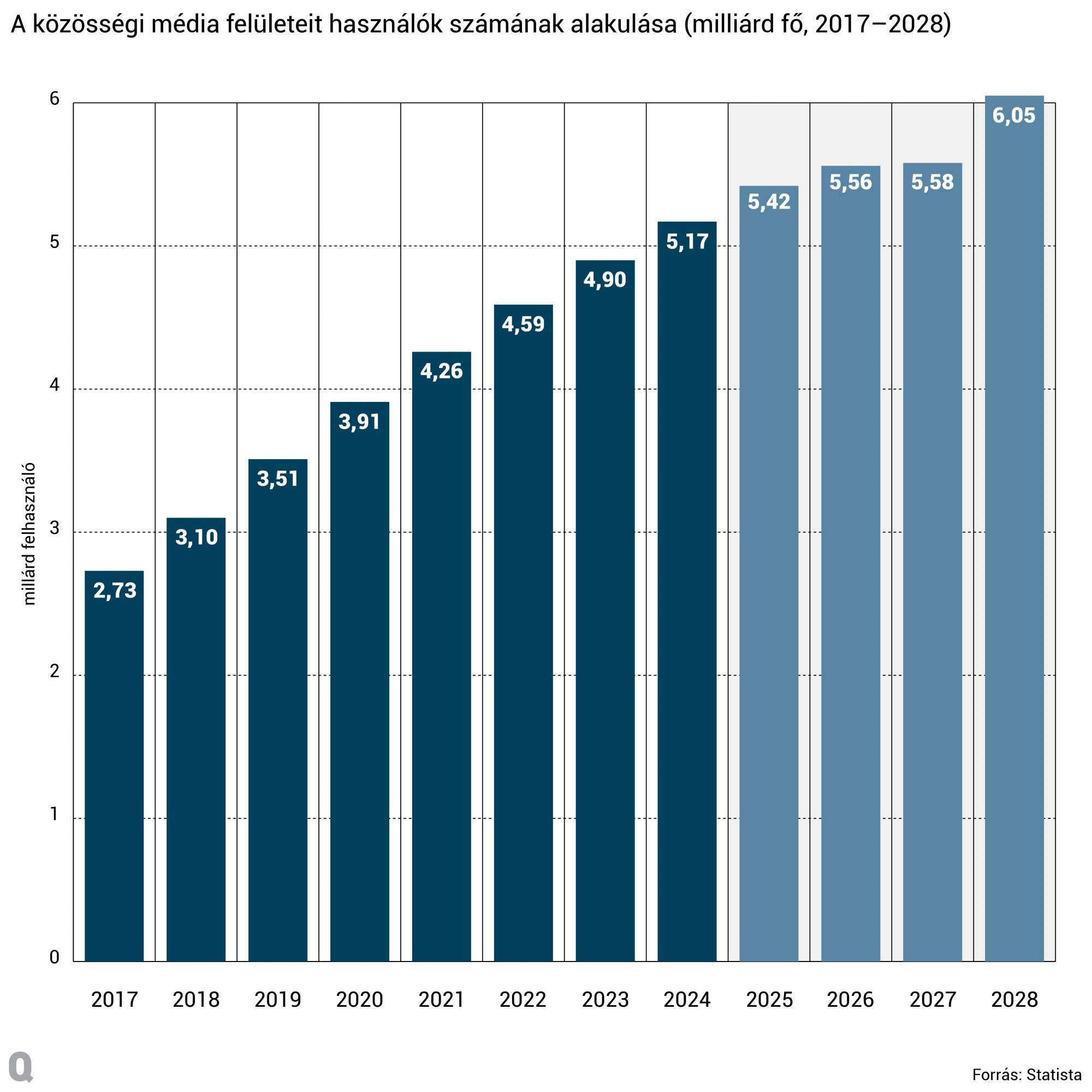 Sokan hajlamosak könnyelműen diagnosztizálni magukon a közösségimédia-függőséget, amire vagy az a válaszuk, hogy digitális detoxra vonulnak, vagy egyszerűen csak nem foglalkoznak vele. A statisztikák mindenesetre alátámasztják, hogy egyre többen és egyre többet használjuk a közösségi médiát. A Data Reportal 2025. júliusi adatközlése szerint globálisan 5,41 milliárd felhasználója van az egyes platformoknak, ami a bolygó lakosságának 65,7 százalékát fedi le, míg a Statista szintén júliusi adatai szerint egy átlagos felhasználó napi 151 percet tölt közösségimédia- és üzenetküldő felületeken, ami 40 perces emelkedést jelent a tíz évvel ezelőtti adatokhoz képest. Ráadásul az is látszik, hogy a becslések szerint nem lassul a felhasználók növekedésének üteme, így a számuk 2028-ra a 6 milliárdot is átlépheti.
