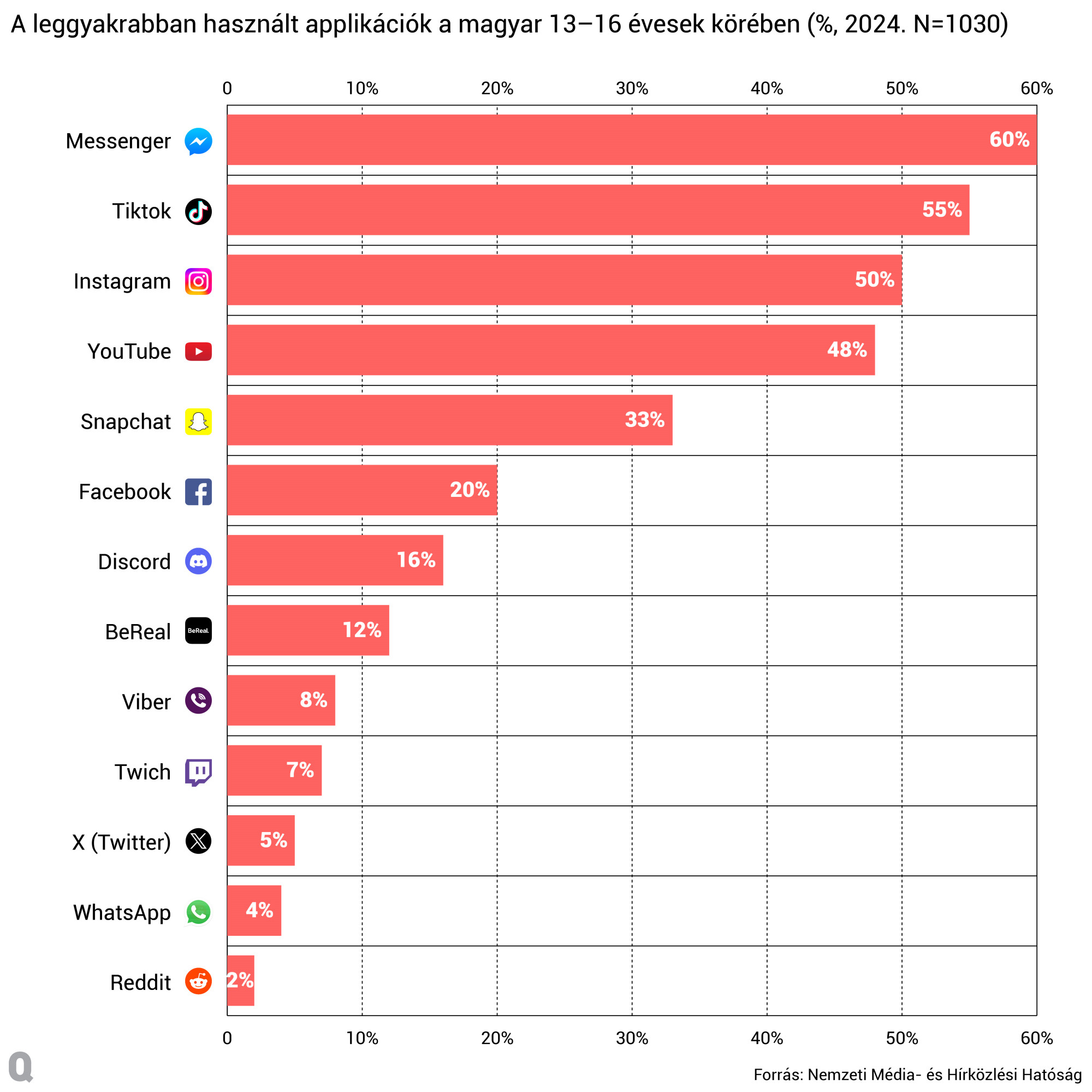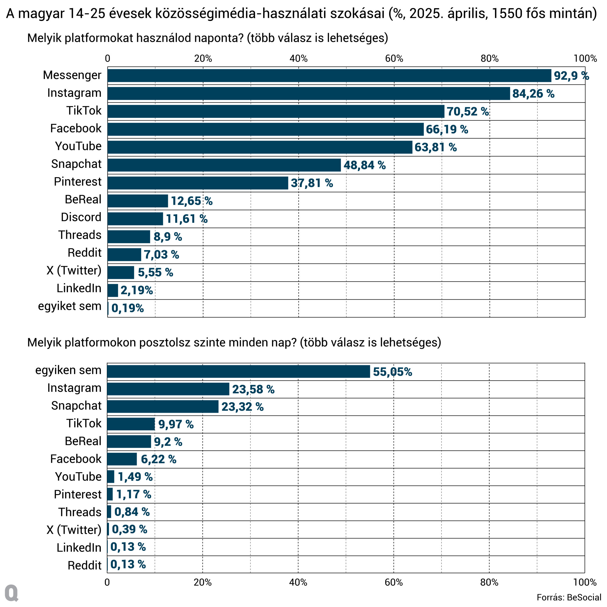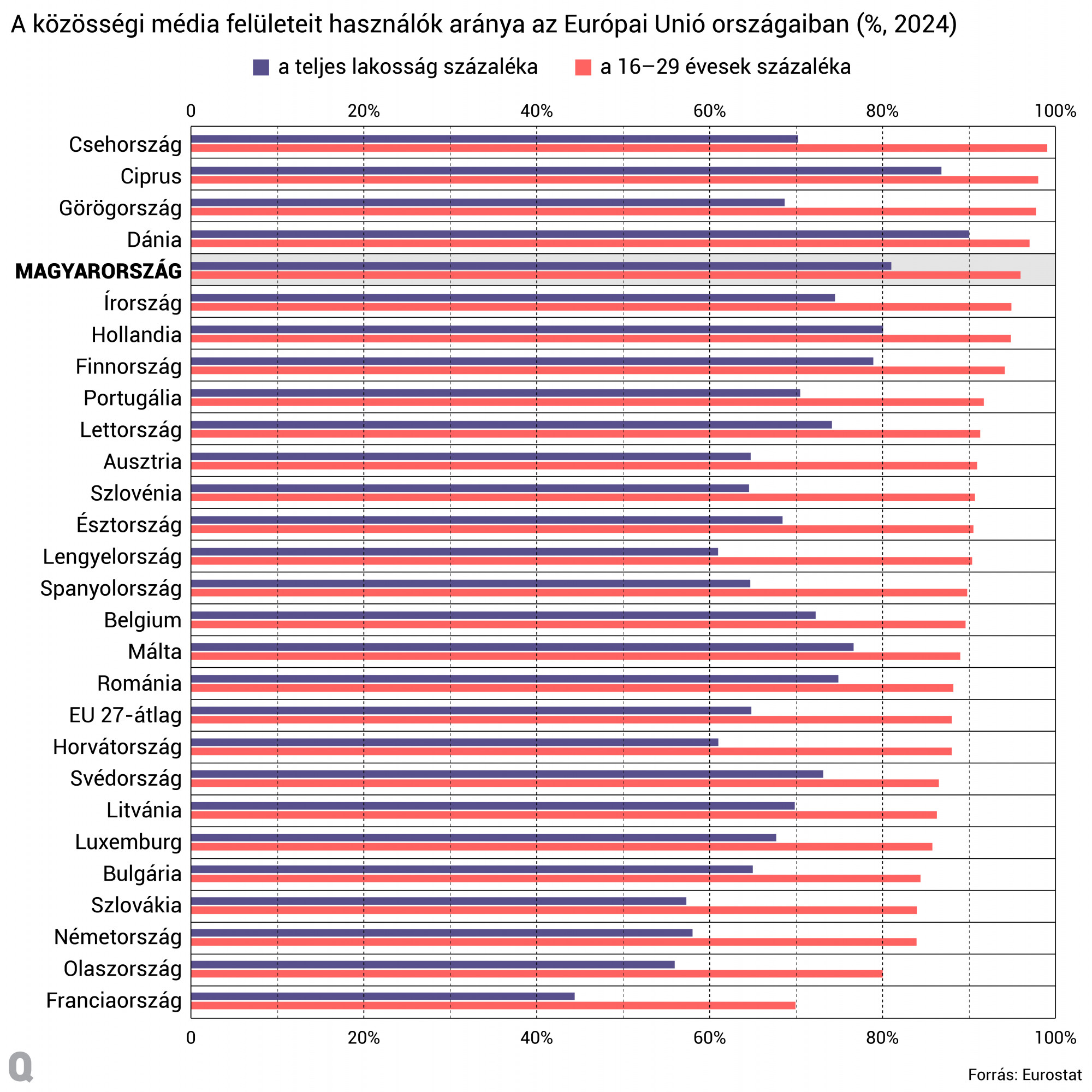 Az Eurostat legfrissebb, a 16 és 29 év közötti korosztály internethasználatát felmérő statisztikája szerint a magyar fiatalok az élvonalban vannak a közösségi média használatát tekintve, igaz, az adatok nem mutatnak eget rengető különbségeket: a magyar fiatalok 95 százaléka aktív legalább egy közösségimédia-platformon, míg ez az arány Csehországban 99, Cipruson és Görögországban 98, Dániában pedig 97 százalék. A legalacsonyabb arányokat Franciaországban regisztrálták 70, Olaszországban 80, valamint Németországban, Szlovákiában és Bulgáriában 84 százalékkal. A teljes lakosságot tekintve még előrébb tartunk: a magyarok 80 százaléka használja a közösségi médiát, és ezt csak Cipruson és Dániában múlták felül a 2024-es adatgyűjtés során.