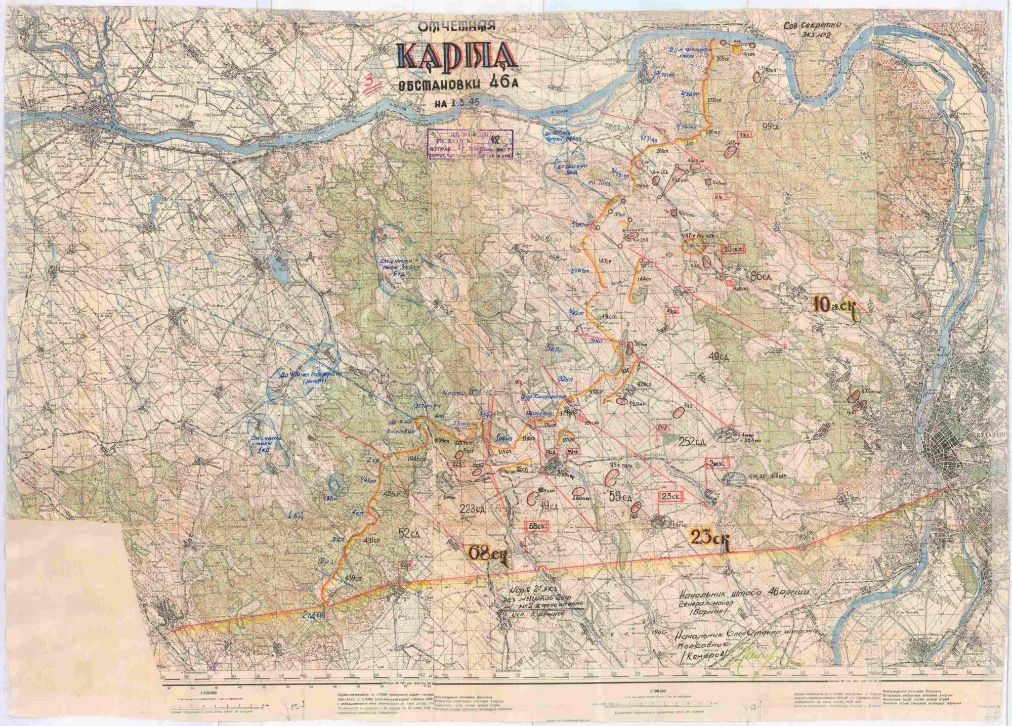 - A szovjet 46. hadsereg 1945. március 1-jei helyzetét szemléltető hadműveleti áttekintő térkép. Centralnij Arhiv Minyisztyersztva Oboroni Rosszijszkoj Fegyeraciji [Oroszországi Föderáció Védelmi Minisztériumának Központi Irattára] – Podolszk. Fond: 401, Opisz: 9511, Gyelo: 575.