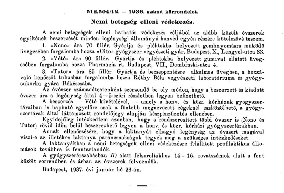 - 512.504/12. — 1936. számú körrendelet. „Nemi betegség elleni védekezés.” In: Honvédségi Közlöny. LXIV évfolyam, 1937. február 1., 3. szám. 15.