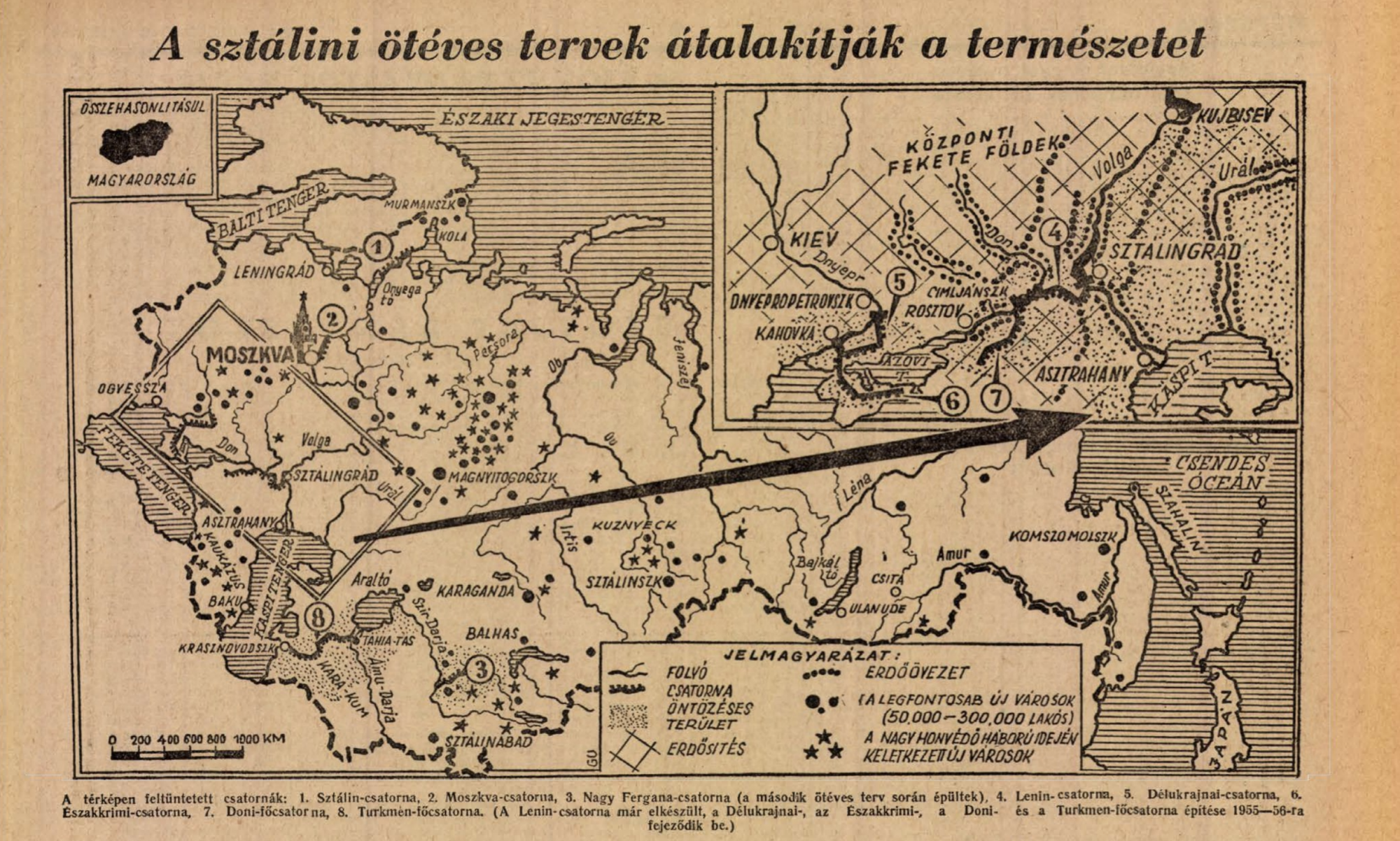 „A Kaspi-tenger és az Aral-tó, valamint azok a folyók, amelyeket öntözésre használnak fel, együttesen 5-6 millió négyzetkilométernyi vízfelületet alkotnak, amely nagyobb, mint fél Európa. Óriási mennyiségű lesz tehát az a víz, amely a folyókból és tengerekből az öntözőcsatornákon keresztül eljut a félsivatagok és aszály sújtotta vidékek talajához. Harmincnyolcmillió hektárnyi földön új növényi takaró keletkezik, az öntözés és az új növényzet az éghajlatot is befolyásolja majd. A nap energiája, amely ezen a vidéken haszon nélkül perzselte a kopár talajt, gazdag termést érlel az oázisokban” – írta a Népszava a nagyravágyó szovjet mintatervről. Azt ma már jól tudjuk, hogy mi lett az Aral-tóval, miután a tavat tápláló folyók (Amu-darja, Szir-darja) vizét eltérítették a gyapotföldek öntözésére: bár korábban a világ negyedik legnagyobb tavának számított, az elmúlt hetven évben tizedére csökkent a területe, négy kisebb tóra szakadt, nagyobb részét ma már Aralkum-sivatagként jegyzik az atlaszok.