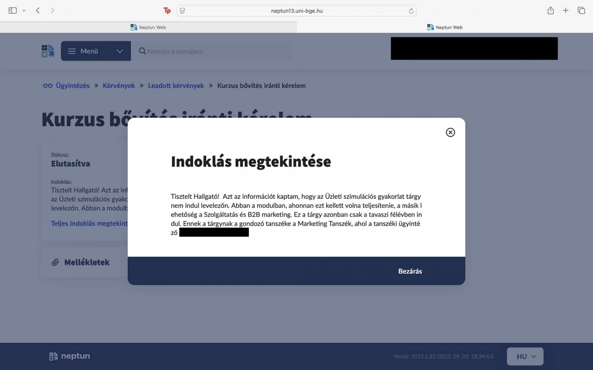 Ő arról is beszámolt, hogy a Kereskedelem és marketing szakos társaival olyan tárgyakat nem tudnak felvenni, amik kötelezők lennének, mert eleve annyira kevés helyet hirdettek meg, hogy képtelenség rájuk beférni. „Van olyan tárgy, amit hetven embernek kellene felvennie, erre 27 férőhelyet hirdettek meg, ami addigra már betelt, mire a tárgyfelvételkor bejutottam a Neptunba” – mondta.