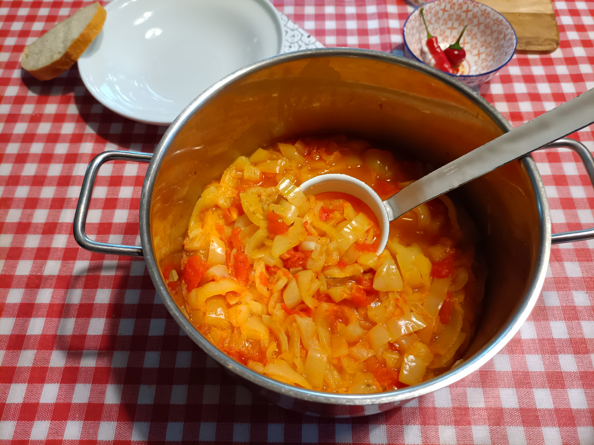 Miután ezen túltettem magam, kezdődhetett a munka: az utasításnak megfelelően kicsumáztam és kimagoztam egy kiló paprikát, megmostam, egy percre forró, majd hideg vízbe mártottam fél kiló paradicsomot, hogy le lehessen húzni a héját, és felaprítottam két közepes vöröshagymát. A hagymát olajon megdinszteltem, majd lehúztam a fazekat a tűzről és rászórtam a pirospaprikát (egy teáskanálnyit). Ekkor kellett volna az erőset is, de az alapreceptben nem szerepelt, így szomorúan lemondtam róla, különben cseresznyepaprika került volna bele és bogyiszlói – de hát most Grok a séf. Hat-hét perc után hozzáadtam a meghámozott, felkockázott paradicsomot (a séf úr nélkül sosem vetemednék ilyen pogányságra), aztán a már kissé lesózott paprikás-paradicsomos alaphoz további egy teáskanál sót és egy csipet borsot adtam. A biztonság kedvéért megkértem Grokot, hogy nevezze el franciául a Grok-módra készült lecsót, a közcímben látható megoldást adta rá. Így talán még mindig jobban el lehetne adni, mint paprikafőzelékként.