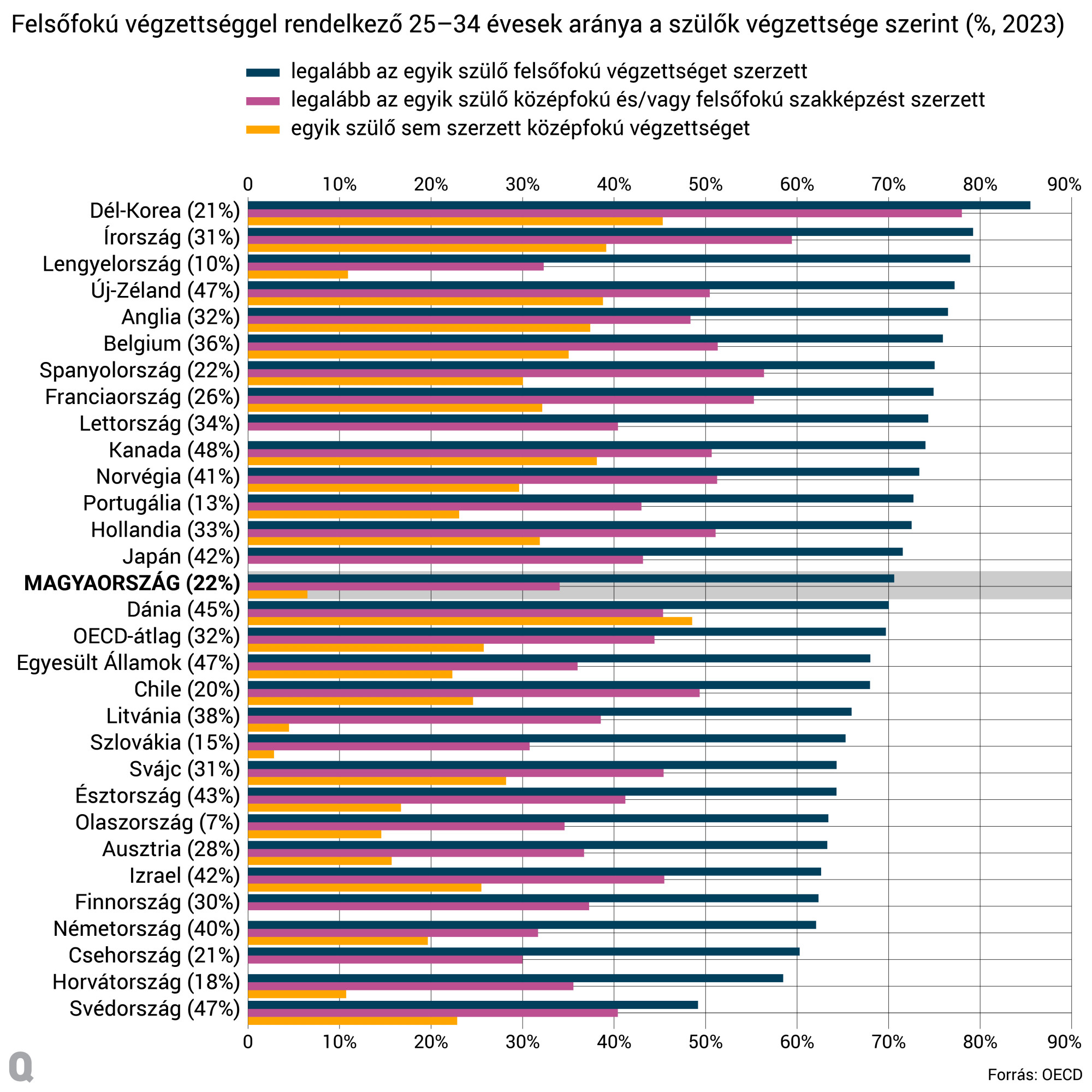 Ami az oktatási egyenlőtlenségek újratermelődését illeti, Magyarországnak idén is sikerült az OECD országok közül az egyik legkiugróbb eredményt elérnie a szervezet friss jelentése szerint: a 25–34 évesek 71 százaléka szerez felsőfokú végzettséget, ha legalább egyik szülője felsőfokú végzettségű, míg mindössze 6 százalék azok közül, ahol a szülőknek nincs többjük nyolc osztálynál. Ez a 65 százalékpontos különbség az egyik legnagyobb az OECD-országok között, ahol az átlag 44 százalékpont.