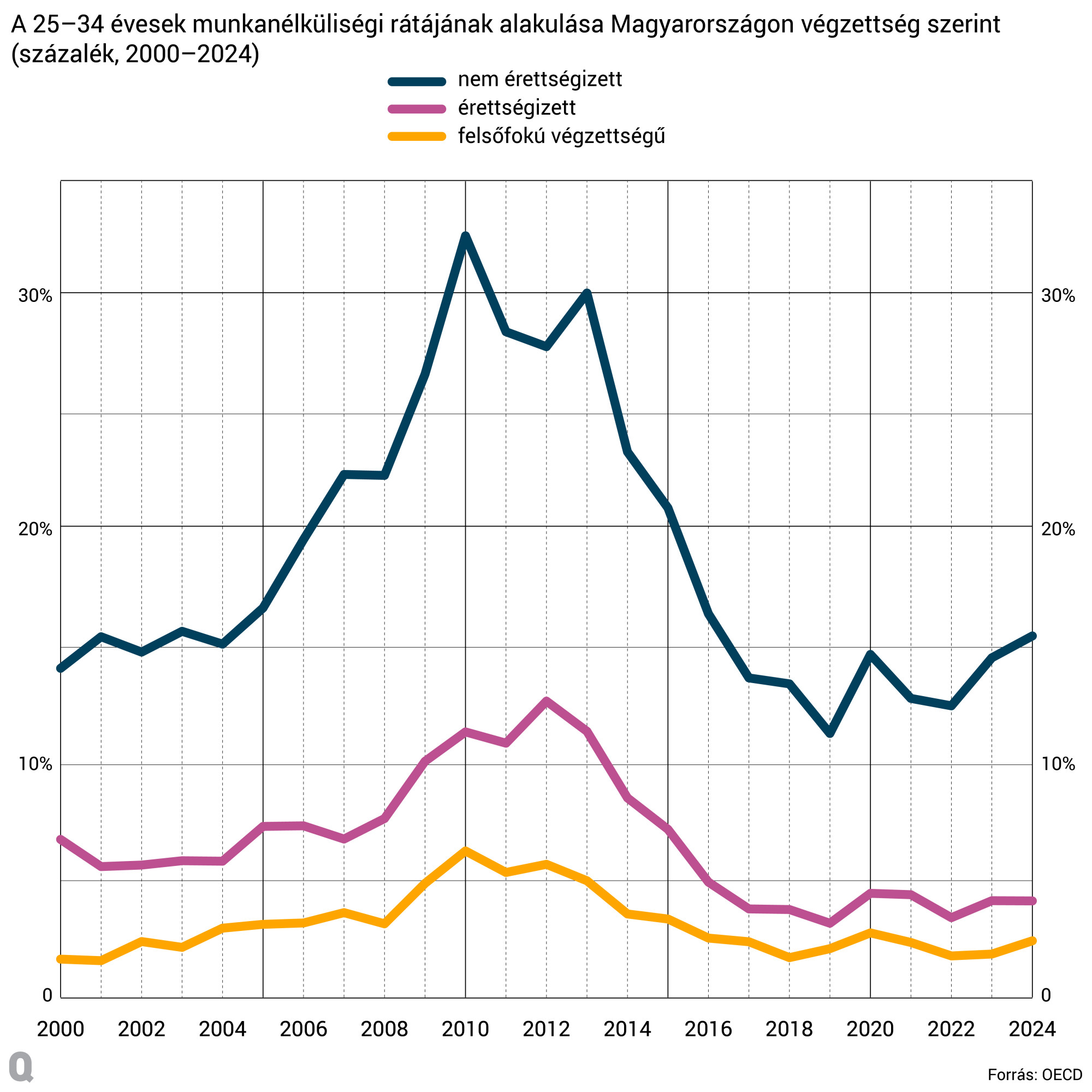 Az viszont kicsit jobb hír, hogy a középfokú végzettség nélküli fiatalok aránya folyamatosan csökken: Magyarország öt év alatt, 2019 és 2024 között egy százalékot faragott le a korábbi 13-ról 12 százalékra, ami még így is eggyel jobb, mint az OECD 13 százalékos átlaga – derül ki az OECD-tagállamok oktatási rendszereinek teljesítményét, finanszírozását és társadalmi hatásait mérő Education at a Glance 2025-ös jelentéséből, amelyben idén a felsőoktatás helyzete került a középpontba.