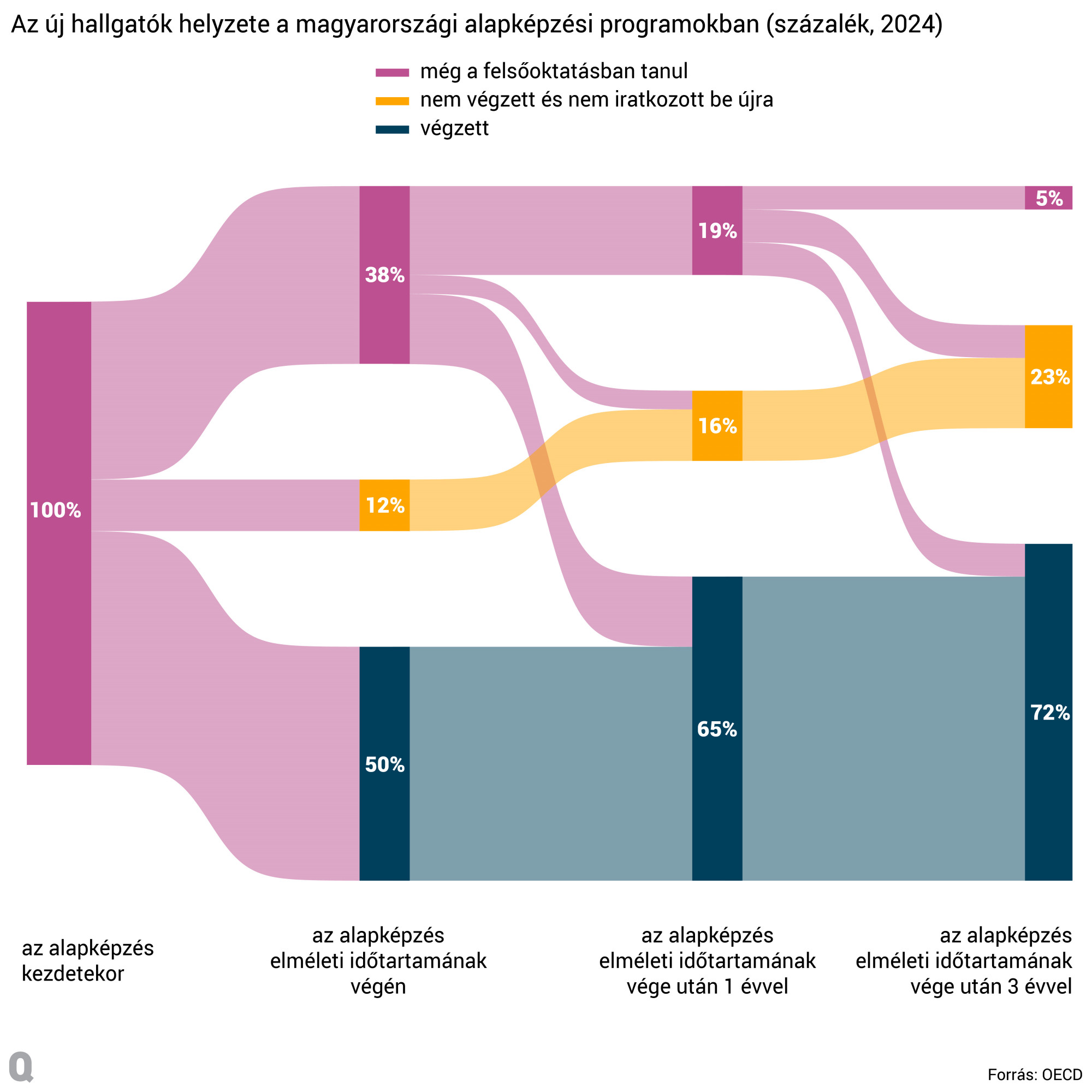 Magyarországon a hallgatók fele (50%) végez a képzés hivatalos ideje alatt, egy évvel később 65 százalék, három évvel a képzés vége után pedig 72 százalék szerzi meg a diplomáját. Összehasonlításképpen az OECD-országokban ugyanez 43, 59 és 70 százalék. Az sem mindegy, hogy nőkről vagy férfiakról beszélünk: az alapképzést kezdő nők nagyobb valószínűséggel fejezik be sikeresen felsőfokú tanulmányaikat a képzés befejezését követő három éven belül, mint a férfiak. Ez Magyarországon 15 százalékpontos különbség (a nők 79 százaléka, a férfiak 64 százaléka végez), ami meghaladja az OECD-átlagot (12 százalékpont).