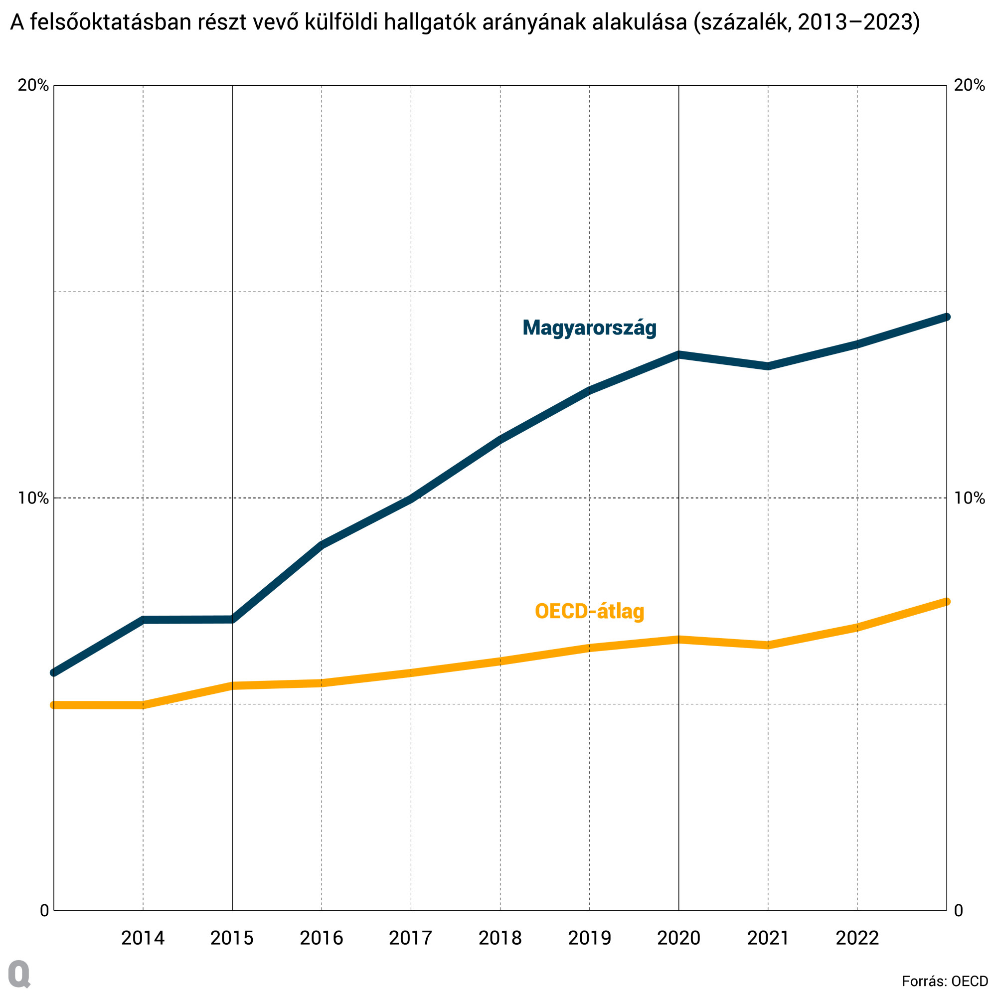 Talán az is kevésbé ismert, hogy egyre több külföldi diák tanul a magyar egyetemeken. Míg az OECD-országokban 2018-ban a felsőoktatásban tanulók 6 százaléka volt külföldi hallgató, 2023-ra ez az arány 7,4 százalékra nőtt, addig Magyarországon még látványosabb ez a növekedés: 2018-ban 11,4 százalék, 2023-ban már 14,4 százalék volt a külföldi hallgatók aránya.