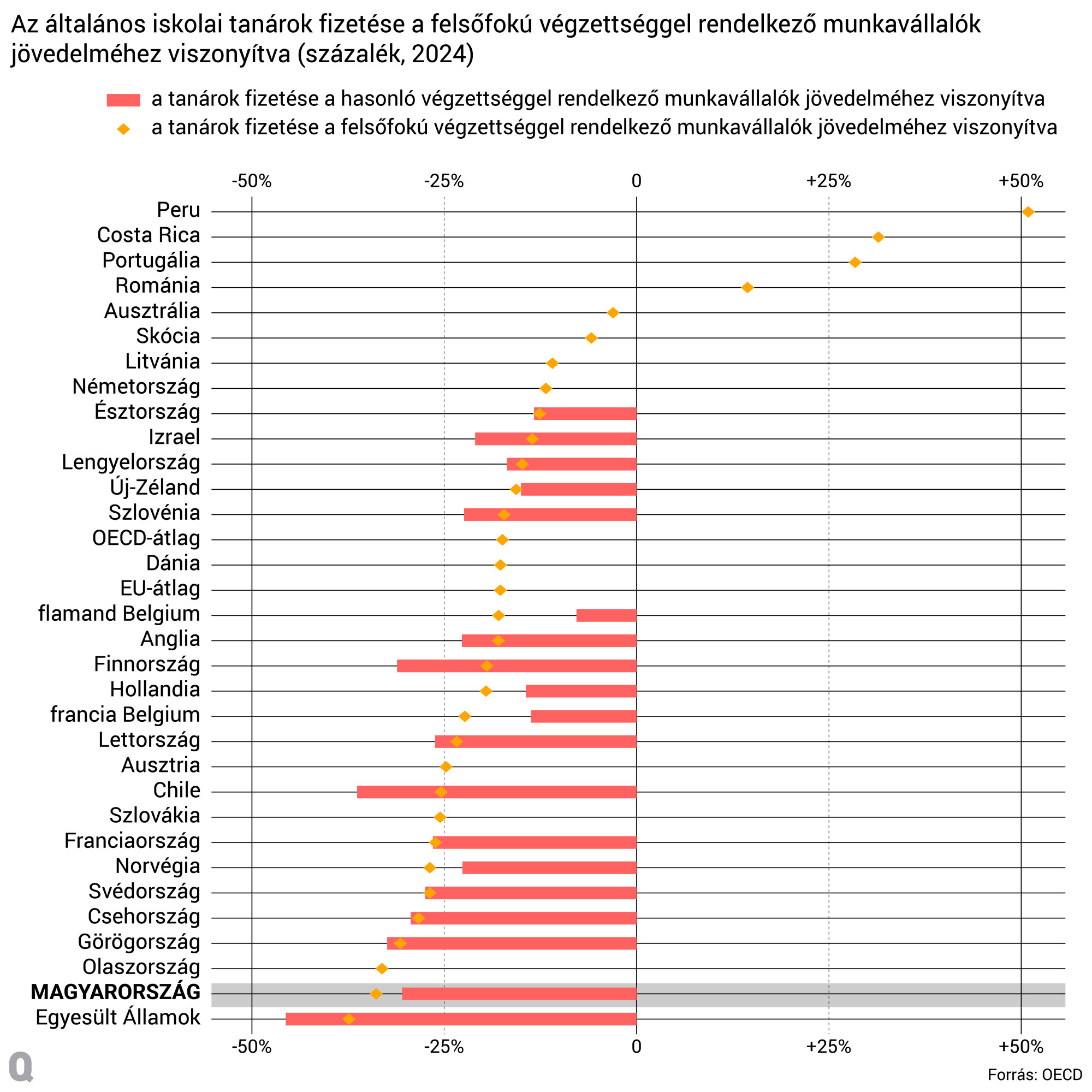 Az utóbbi évek legnagyobb és leghangosabb oktatási ügye a tanárok megalázóan alacsony bére volt, ami a jelentés szerint még mindig jelentősen elmarad más felsőfokú végzettségűek keresetétől. Magyarországon az általános iskolai tanítók bére 34 százalékkal alacsonyabb, míg ez az OECD-átlagában 17 százalék. Bár a tanári bérek 2015 óta nagyobb mértékben emelkedtek Magyarországon, mint az OECD-átlagban (34,7% vs. 14,6%), a különbség továbbra is jelentős.