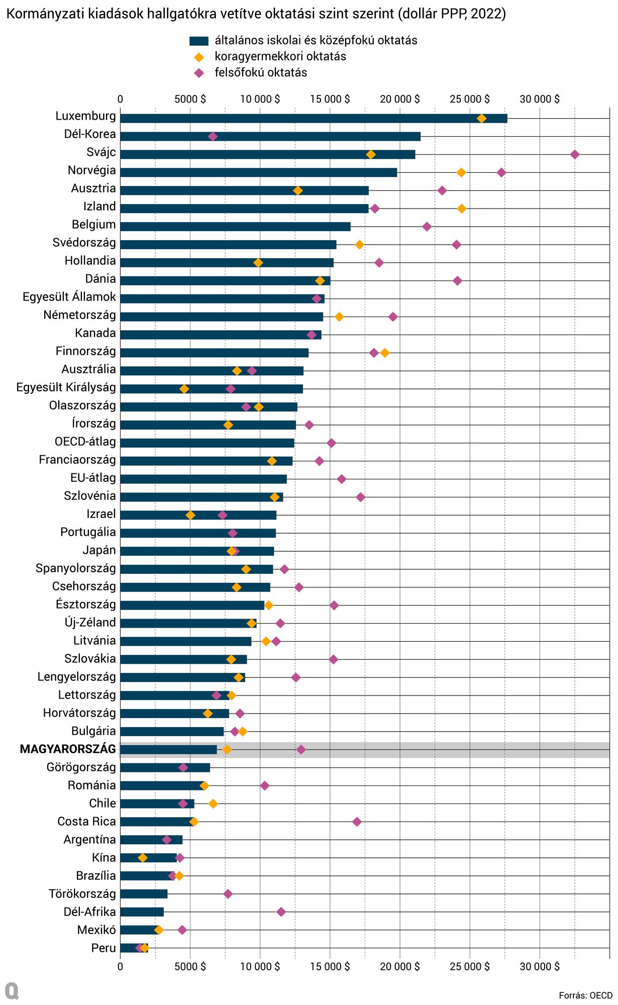 Az OECD adatai alapján Magyarország az oktatási kiadásokat tekintve az országok alsó sávjába tartozik: az általános iskolától az érettségire épülő, de nem felsőfokú szakmai képzésig diákonként 6905 dollárt (2022-es árfolyamon 2,68 millió forint) költ, a felsőoktatásban pedig 12 931 dollárt (5,02 millió forint) – ez elmarad az OECD-átlagtól, ami 15 102 dollár (5,86 millió forint). Az oktatási kiadások a GDP 3,4 százalékát teszik ki, szemben az OECD 4,7 százalékos átlagával.
