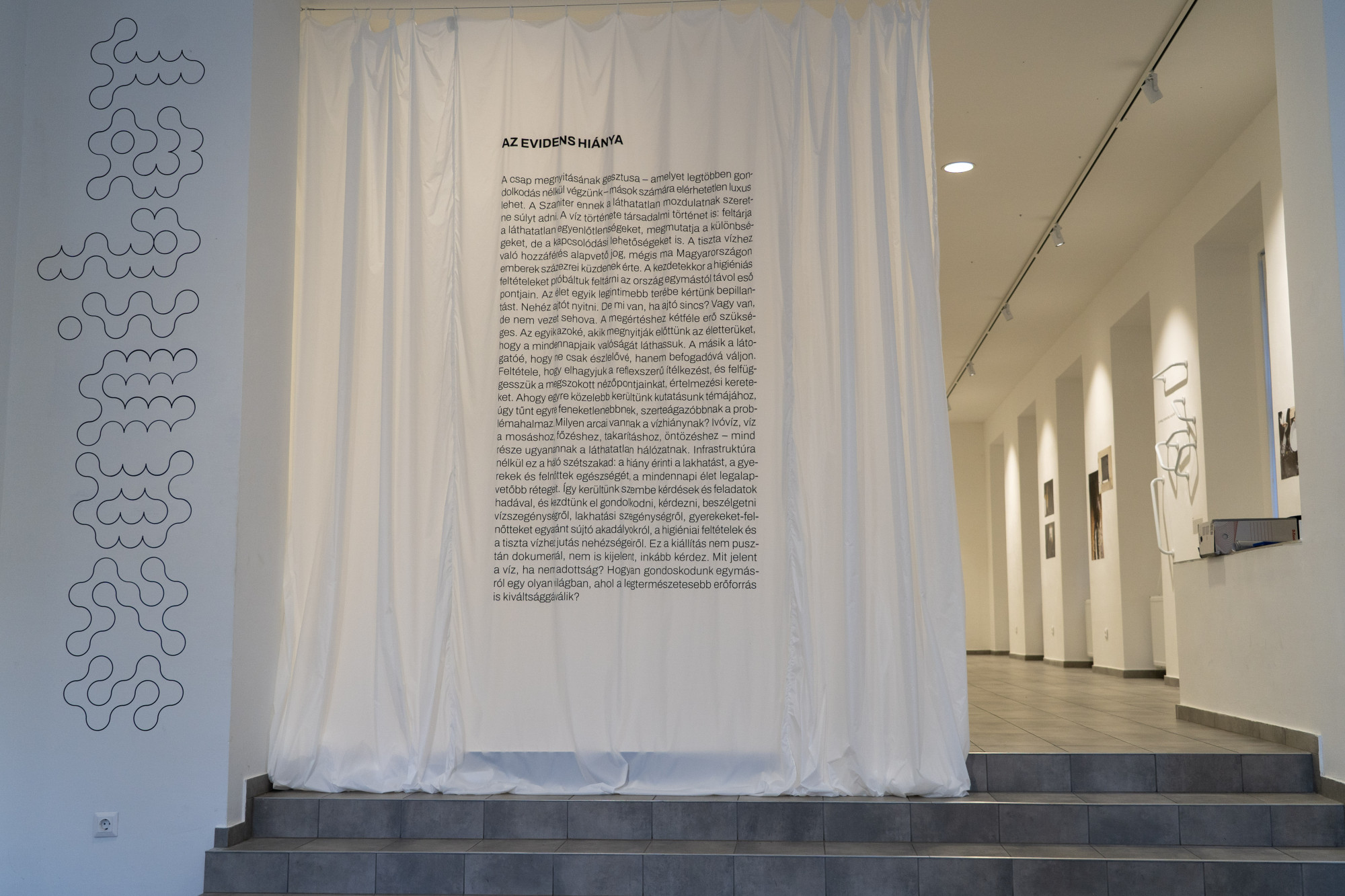 De csak a víznél maradva: a fürdőszoba még mindig intim téma, akkor is, ha nincs. Az előbb említett szövegen túl a kiállítás belépőjének egy hatalmas zuhanyfüggöny számít, amin szintén egy hosszú szöveg olvasható, ennek a zárómondata a címben is idézett sor: „Hogyan gondoskodunk egymásról egy olyan világban, ahol a legtermészetesebb erőforrás is kiváltsággá válik?”.