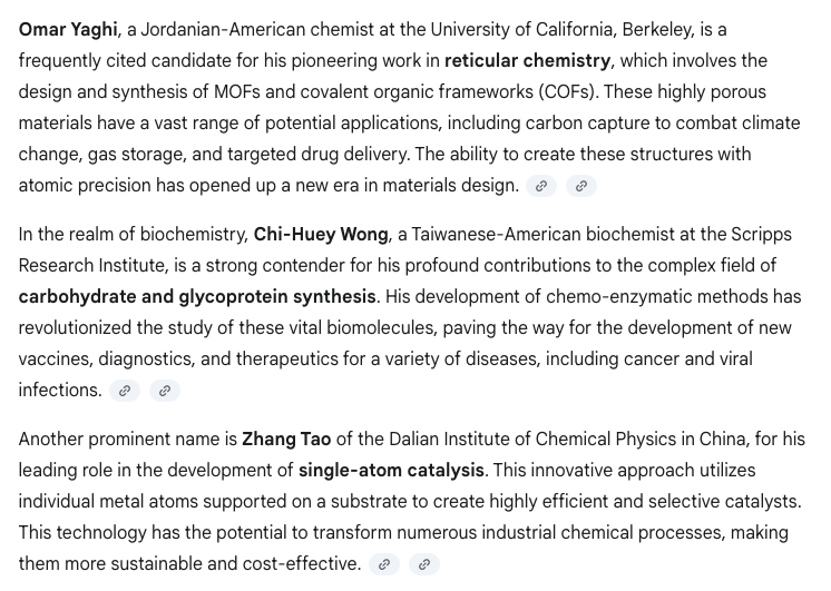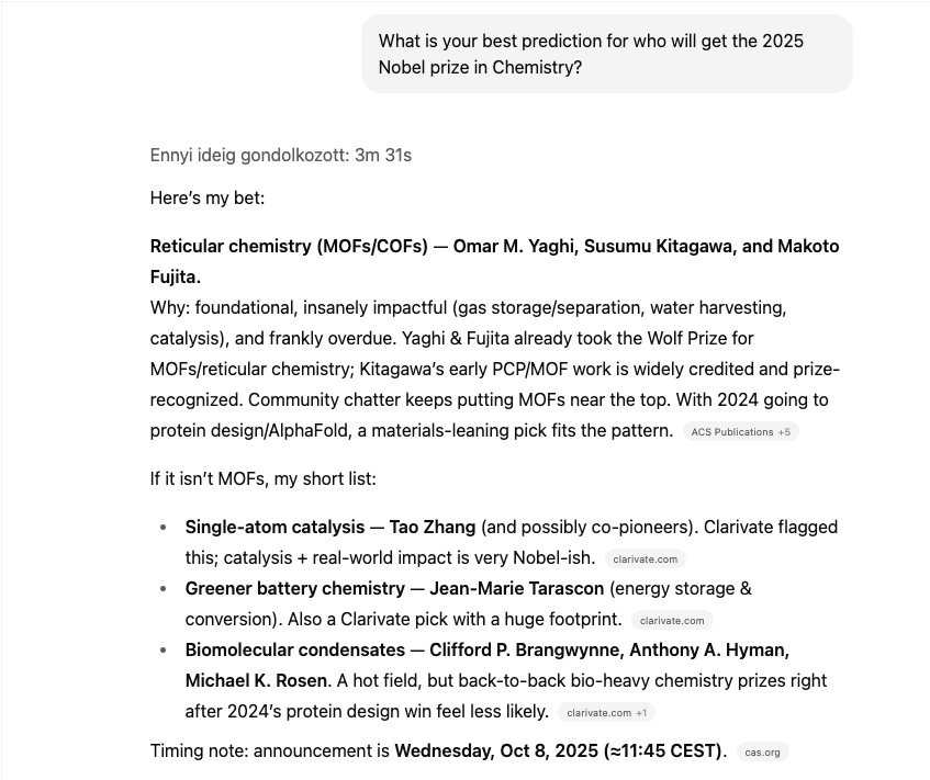 A ChatGPT érvelő modellje, a GPT-5 Thinking a retikuláris kémiára tippel, amiért Yaghinak, valamint Makoto Fujitának, a Tokiói Egyetem professzorának és Kitagava Szuszumunak, a Kiotói Egyetem professzorának adná az elismerést.