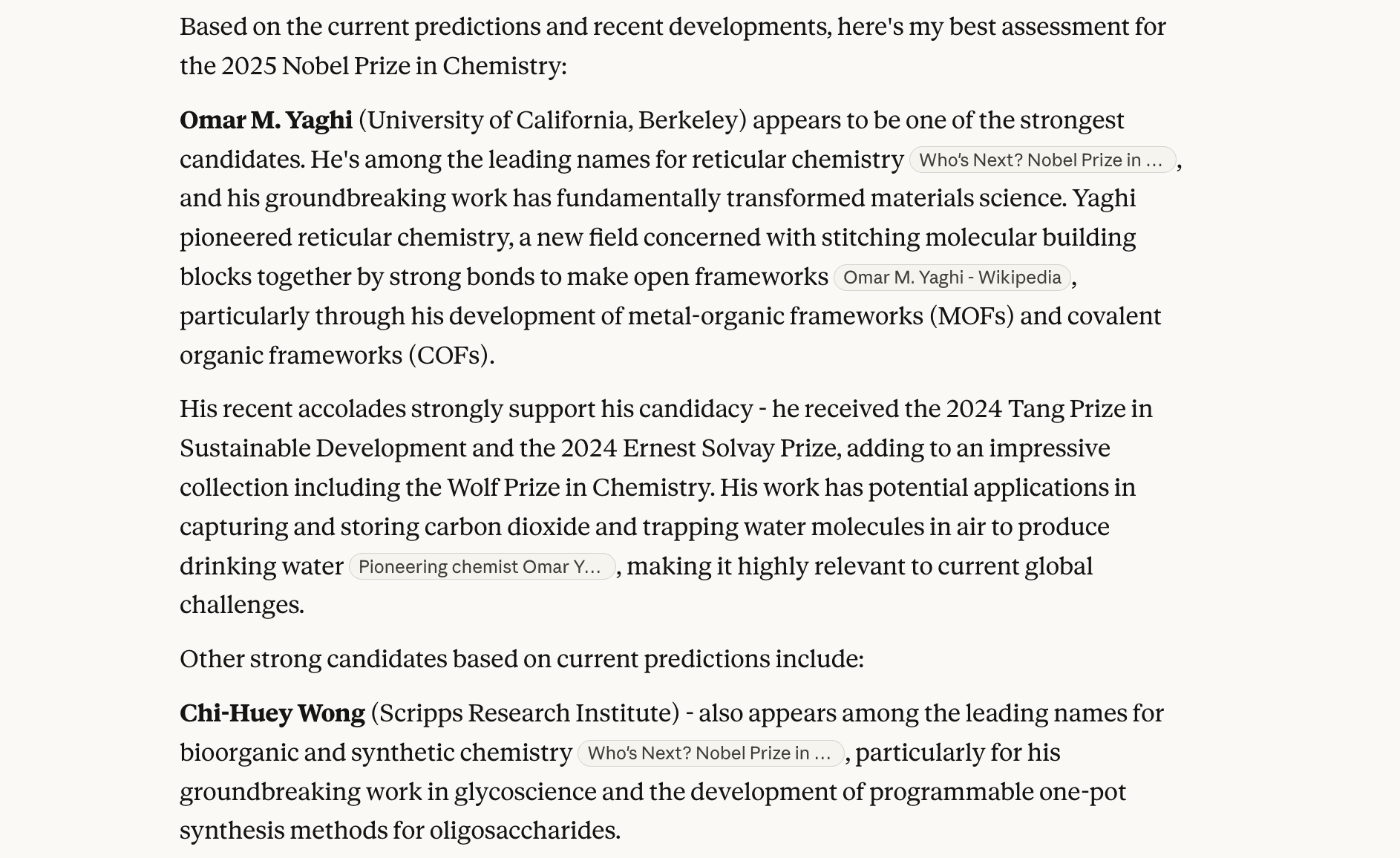 Az Anthropic Claude chatbotjának Opus 4.1 modellje szintén Yaghit jelölte meg, mint aki leginkább esélyes az idei kémiai Nobel-díjra. Emellett lehetséges nyertesként hivatkozott Chi-Huey Wong tajvani-amerikai biokémikusra, aki praktikus módszert dolgozott ki a szénhidrátokat tartalmazó fehérjék (glikoproteinek) és oligoszacharidok szintézisére.