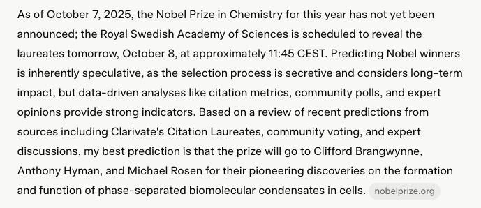 Elon Musk xAI-jának Grok-ja szokásához híven formabontó választ adott, amely szerint Clifford Brangwynne-nek, Anthony Hymannak és Michael Rosennek van a legnagyobb esélye a díjra a sejten belüli fázisszeparált biomolekuláris kondenzátumok terén végzett felfedezéseikért.