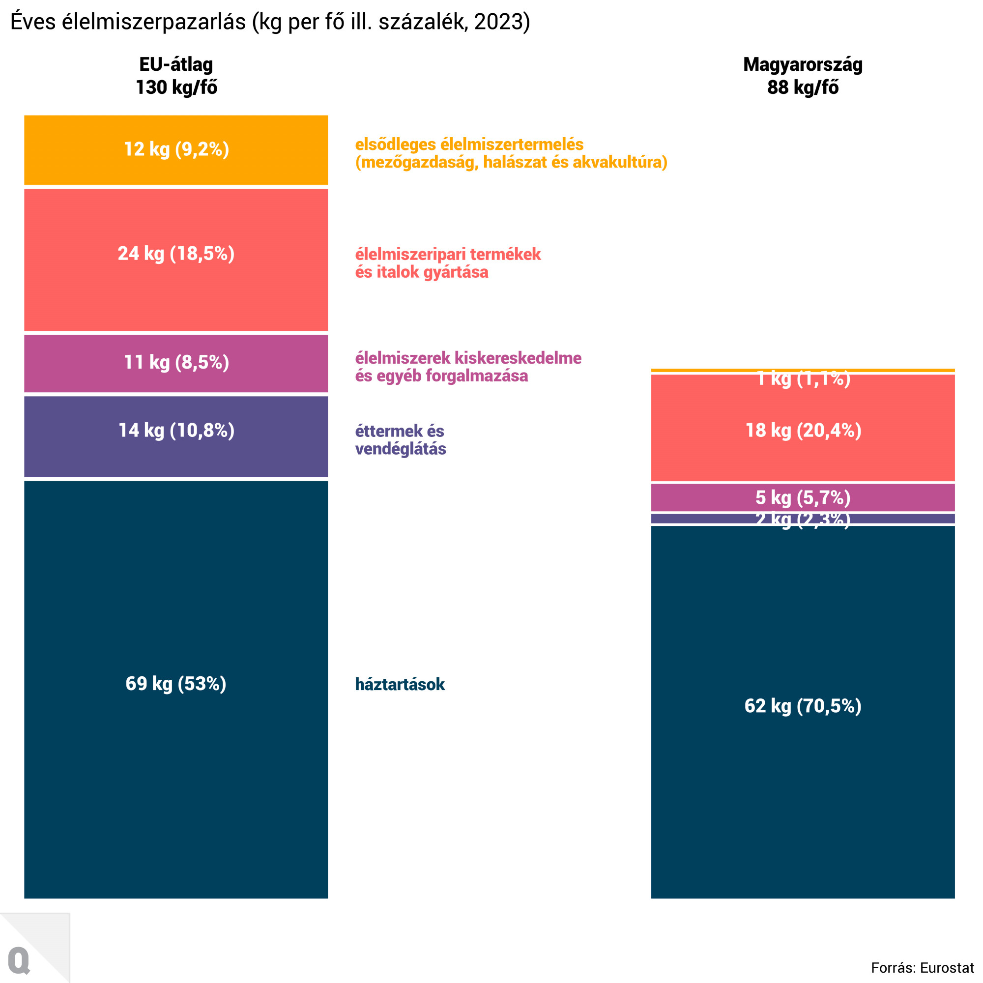 Az Eurostat szerint a háztartási hulladékok az összes élelmiszer-hulladék több mint felét (53 százalék) tették ki, ami lakosonként 69 kilogrammnak felel meg. A fennmaradó 47 százalék az élelmiszer-ellátási láncban produkált hulladék volt: 19 százalék az élelmiszeripari termékek és italok gyártása során (24 kg/lakos), 11 százalék az éttermek és vendéglátóipari szolgáltatások során (14 kg/lakos), 10 százalék az elsődleges termelésben (12 kg/lakos) és 8 százalék az élelmiszerek kiskereskedelmi és egyéb forgalmazása során (10 kg/lakos) keletkezett.