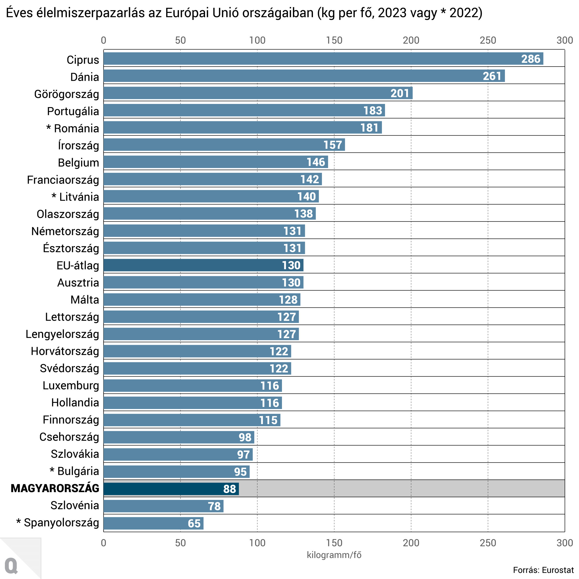 Magyarország az egyik legkevésbé pazarló EU-tagállam a maga fejenkénti 88 kg-jával. Ez kevesebb mint harmada a Cipruson termelt élelmiszer-hulladéknak, amiért feltehetően a turizmus a felelős.