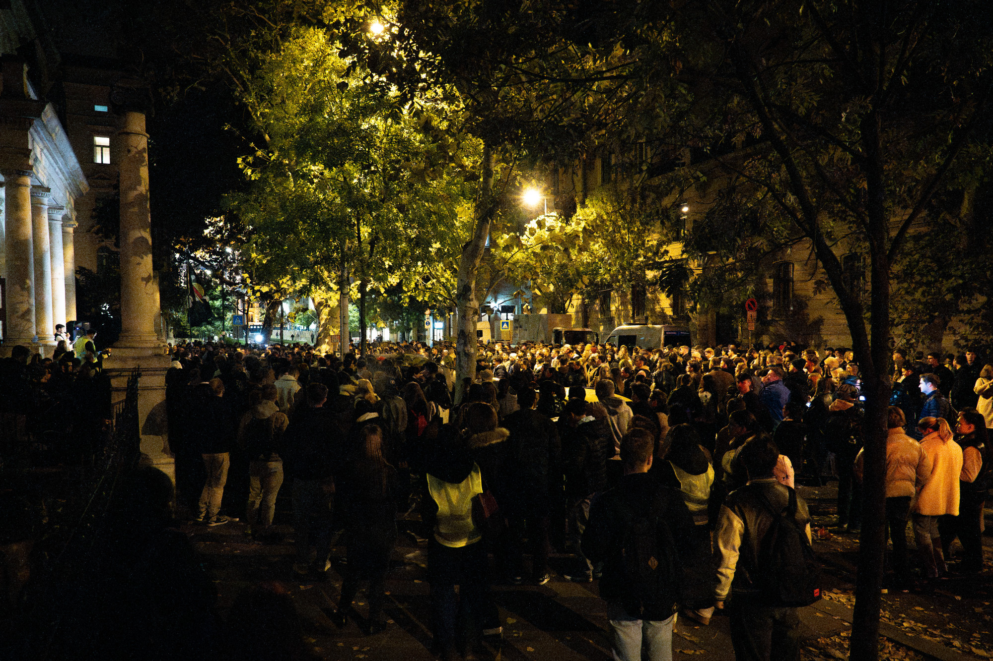 Október 20-án este hatkor még alig lézengett néhány fiatal a Budapesti Gazdaságtudományi Egyetem (BGE) Alkotmány utcai épülete előtt. Pedig a két hangfal már állt a lépcsőn, a szemben lévő járdán pedig néhány, a helyszín biztosítására érkezett rendőr figyelte az utcát. El kellett telnie egy órának, hogy pontosan a kezdésre le kelljen zárni az épület előtt az úttestet, és megérkezzen az a több száz diák, aki a Facebookon kifejezte részvételi szándékát.