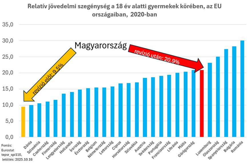 „Ha a KSH jövedelem-adatok revíziója előtti adatokat teszi bele az EU összehasonlításba, azt fogja látni, hogy nálunk a legkisebb a gyermekek szegénysége (lásd az ábrán a narancssárga oszlopot), ha a revízió utániakat, akkor meg a piros oszlop jelzi Magyarország helyét (ami szerint a mi adataink a hatodik legmagasabb szegénységi rátára utalnak az EU-ban)” – írta kedden Facebook-oldalán Tóth István György szociológus, a TÁRKI vezérigazgatója.