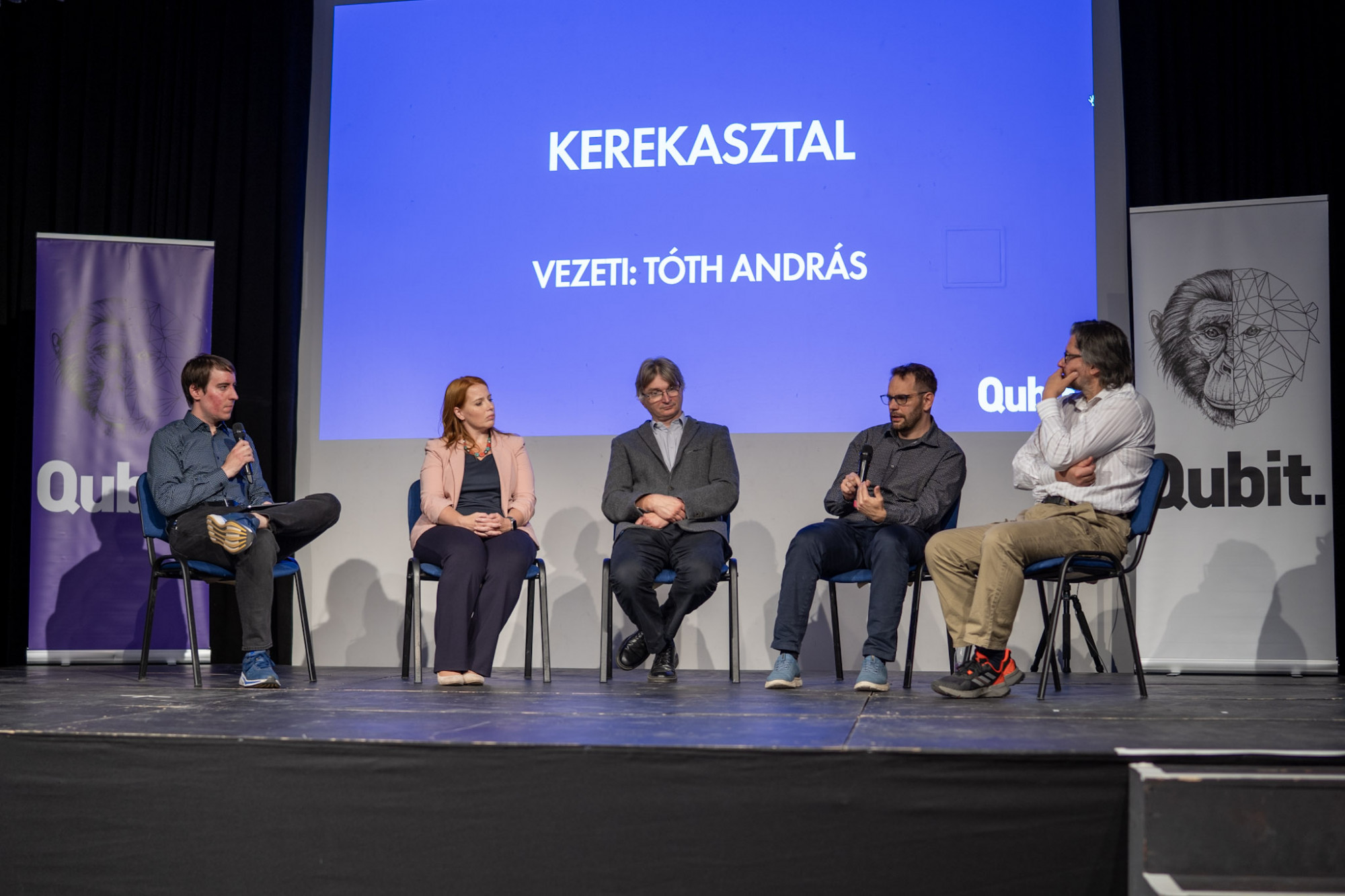 A 12. Qubit Live előadásai után kerekasztal-beszélgetésen folytattuk a mesterséges intelligencia legfontosabb kérdéseinek kitárgyalását. Tóth András, a Qubit újságírójának kérdésére Gáspári Zoltán bioinformatikus elmesélte, hogy a mesterséges intelligencia hogyan használható a tudományban. Saját területénél maradva elmondta, hogy a fehérjeszerkezetek feltárásában és az életünket alakító molekulák kölcsönhatásainak megértésében segítő AlphaFold algoritmus rendkívüli mértékben megkönnyíti a kutatók munkáját azáltal, hogy olyan hipotéziseket generál, amiket aztán kísérletekben tesztelni tudnak. Ám ezeket a kísérleteket ugyanúgy el kell végezni, ráadásul a gyógyszerfejlesztés sarokköve épp a klinikai vizsgálatok lefolytatása, amit emberek nélkül nem lehetne megoldani, tehát az AI fontos segítséget jelent, de nem helyettesíti a kutatókat, szakembereket.