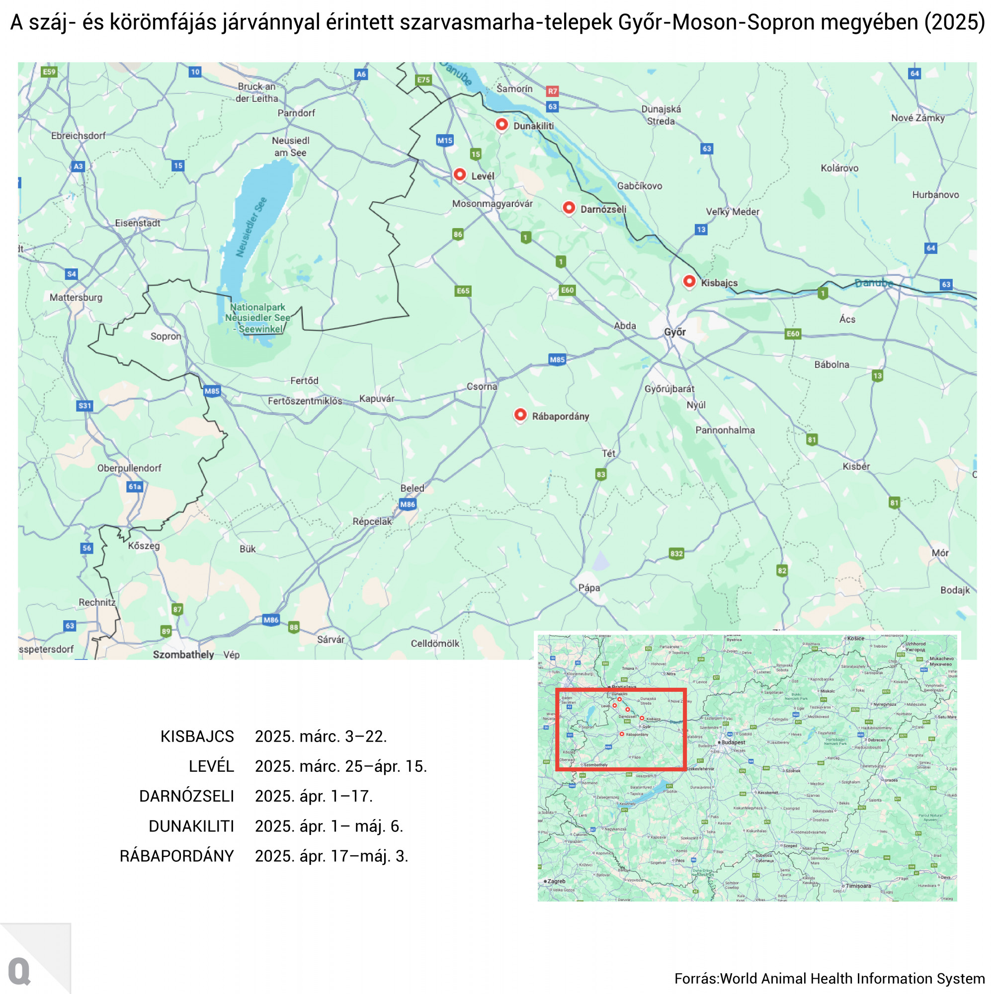 A 2025-ös kitörések nem Magyarországon kezdődtek, így a szakembereknek legalább néhány hétnyi idejük volt arra, hogy aktualizálják tudásukat a betegségről: januárban Németországban, vízibivalyokban észlelték a vírust, ezzel 14 év után ütötte fel újra a fejét az RSZKF az Európai Unióban. Március elején aztán Magyarországon és Szlovákiában, egymáshoz közeli telepekről jelentették a fertőzés felbukkanását. Itthon öt Győr-Moson-Sopron megyei települést érintett a járvány: először Kisbajcson, majd néhány hét elteltével Levél, Darnózseli, Dunakiliti és Rábapordány községekben tűnt fel a száj- és körömfájás, és Dunakiliti kivételével mindenhol sikerült három héten belül felszámolni a fertőzést.