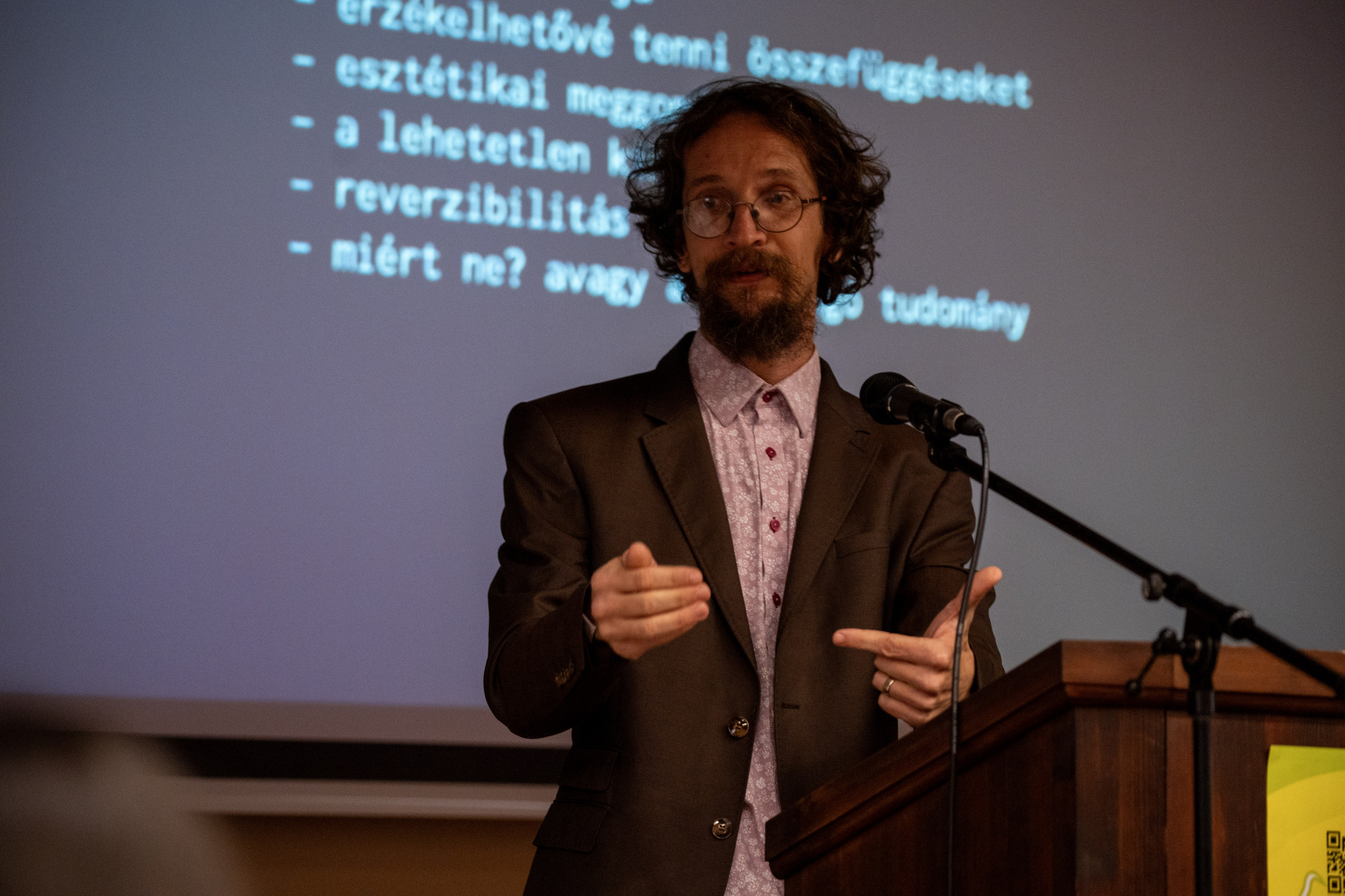 Na de előbb oda is kellett érni. A kezdés csúszott, egy előadás elmaradt, így még bőven időben futottunk be a helyszínre, ami első blikkre egyáltalán nem illett a bohém ötlethez, az előtérben cukrászda-kávézó, kegytárgybolt, az egykori magtár a székesegyház árnyékában áll, de az ajtó előtt már egy élénkzöld tábla hirdeti, hogy jó helyen járunk, a kint dohányzó Kovács Balázs ezt meg is erősítette, menjünk fel a lépcsőn, aztán balra, ott lesz a konferencia. Mint azt Kovács Balázs (egy másik, a főszervező) később kérdésünkre elmondta, a helyszín csak úgy adódott: miután felmerült benne az ötlet, hogy kéne csinálni egy ilyen konferenciát, először máshova tervezte, de a visszajelzések alapján ez már kicsinek bizonyult, befogadókészség alapján pedig a következő lépés Pécsen a Magtár volt. Nem is volt rossz ötlet nagyobb helyszínt keresni: az első nap teltházas volt, a második már szellősebb, de még így is bőven akadtak érdeklődők.