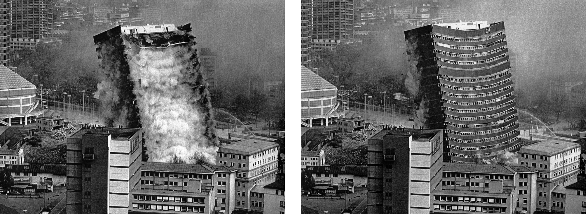 A bemutatót a korai munkákkal kezdte, mint amilyen a Detonation Deutschland (1996): tévés archívumokból és vállalati referenciafilmekből szedte össze épületbontások, épület robbantások képeit. Kizárólag felrobbanó, összerogyó, leomló épületek egymás után. A lebontásra ítélt, használaton kívüli gyárak, lakóépületek, egyben az eltűnő náci infrastruktúra, az eltűnő modernista építészet darabjai. Hét képernyőn, folyosószerű térben, úgy megkomponálva, mint egy szimfónia – ahogy Rosefeldt fogalmaz: a rombolás és a mögötte lévő ideológiák „fordításaként”.