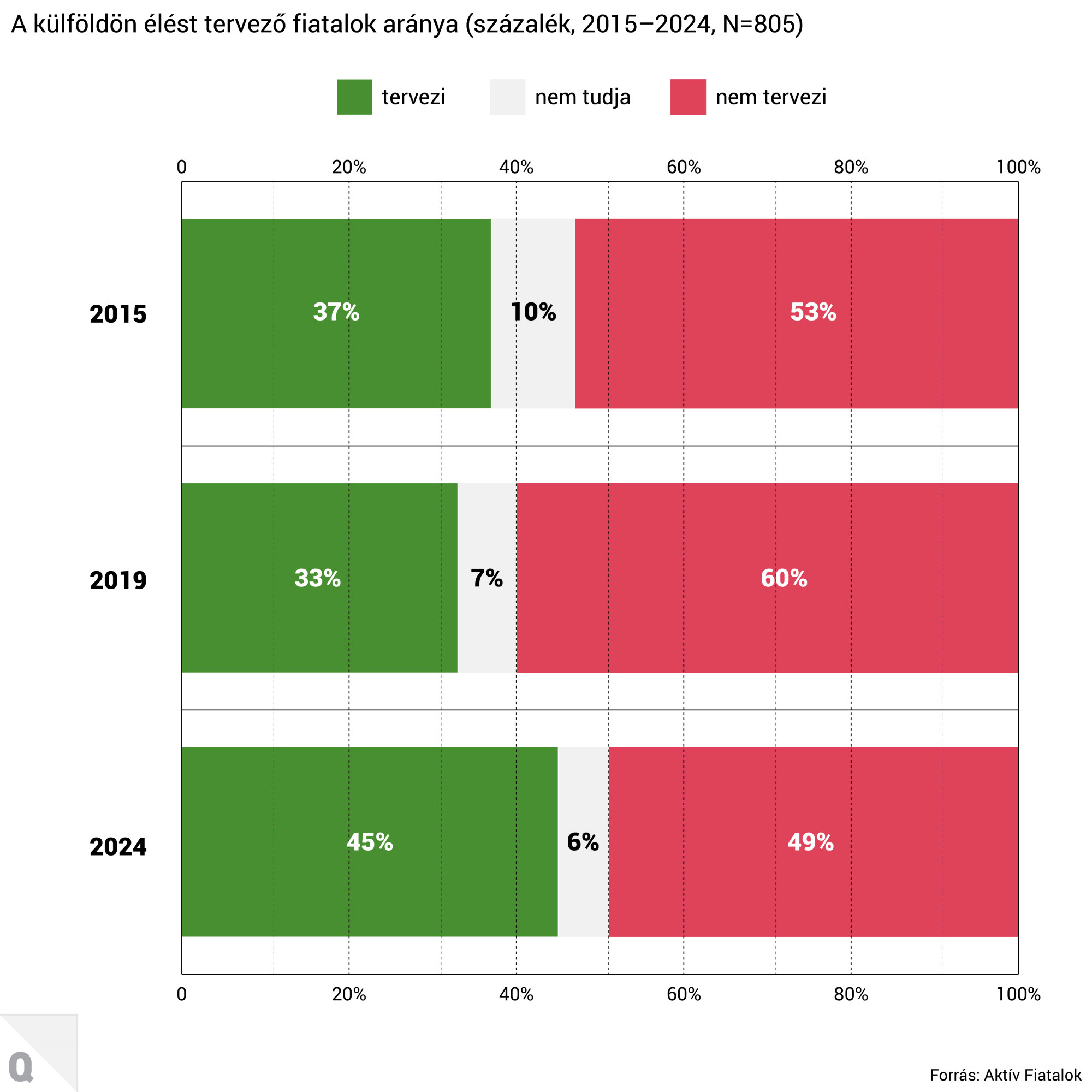 - Az Aktív Fiatalok Kutatócsoport kutatásai pedig teljesen megfelelnek a fent részletezett trendeknek: 2015-ben a nappali tagozatos egyetemisták 37 százaléka tervezett külföldre költözni, ez a gazdasági fellendülés 2019-es időszakában 33 százalékra csökkent, 2024-re viszont sosem látott magasságokba, 45 százalékig emelkedett.