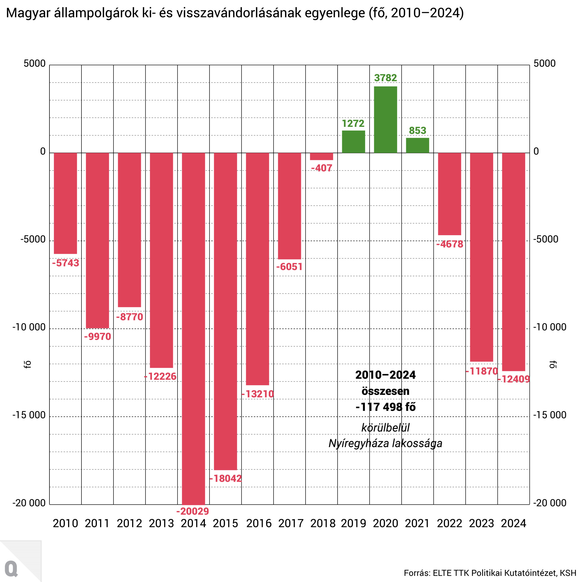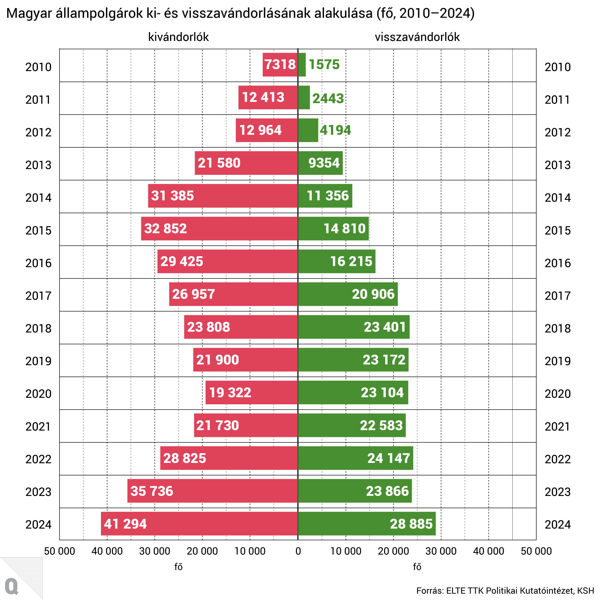 Azonban még így is szembetűnő, hogy a covidjárvány körüli évek rövid visszavándorlási hullámán kívül jóval többen, általában tízezres mértékben hagyják el többen az országot évente, mint ahányan visszatérnek.