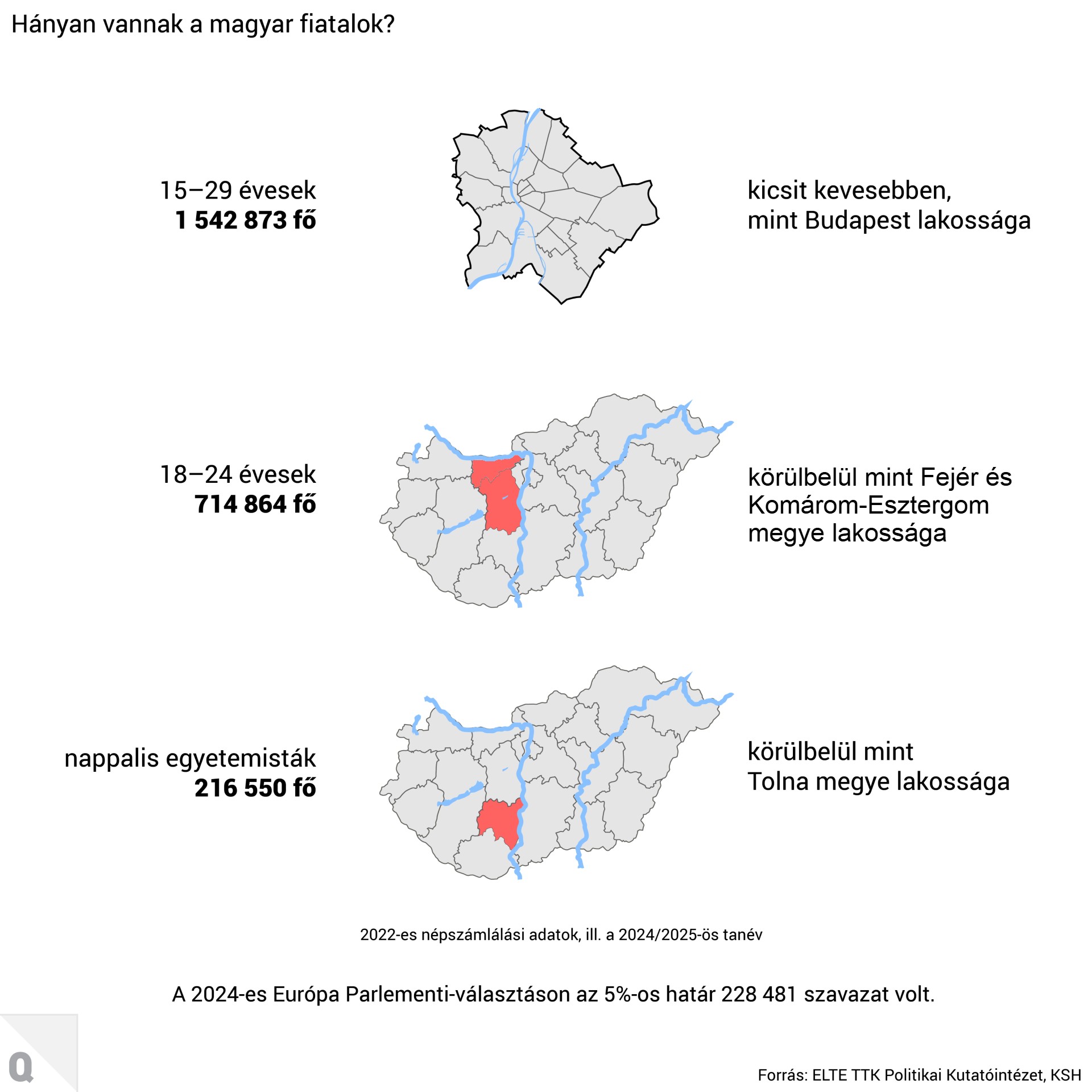 Ha ezt a korcsoportot nézzük, azt látjuk, hogy a magyar fiatalok szinte egész Budapestet el tudnák foglalni, számuk ugyanis a másfél milliót is meghaladja. Ha a szűkebb, 18–24 év közötti korosztályt vizsgáljuk, akkor két megyényi (pl. Fejér és Komárom-Esztergom) fiatal felnőtt él Magyarországon, és ha kizárólag a nappali tagozatos egyetemistákat nézzük, akkor ők Tolna megyét tudnák benépesíteni. A 216 ezres létszámot is meghaladó egyetemisták együttesen akár egy EP-választáson is sikeresen megmérettethetnék magukat, 2024-ben ugyanis 228 481 szavazat kellett az 5 százalékos határ megugrásához – Szabó Andrea legalábbis ezzel érzékeltette, hogy milyen fontos erőt képviselnek a fiatalok.