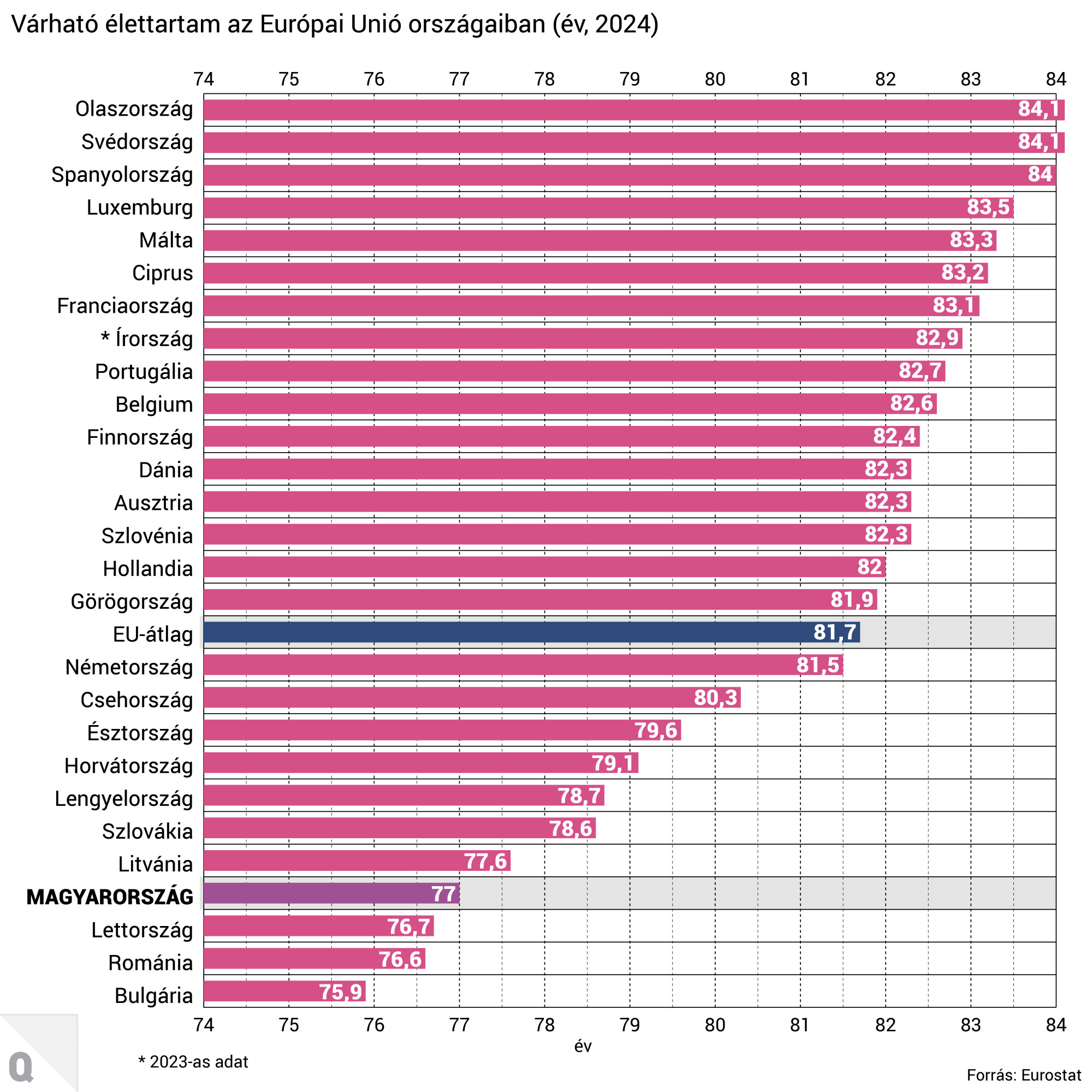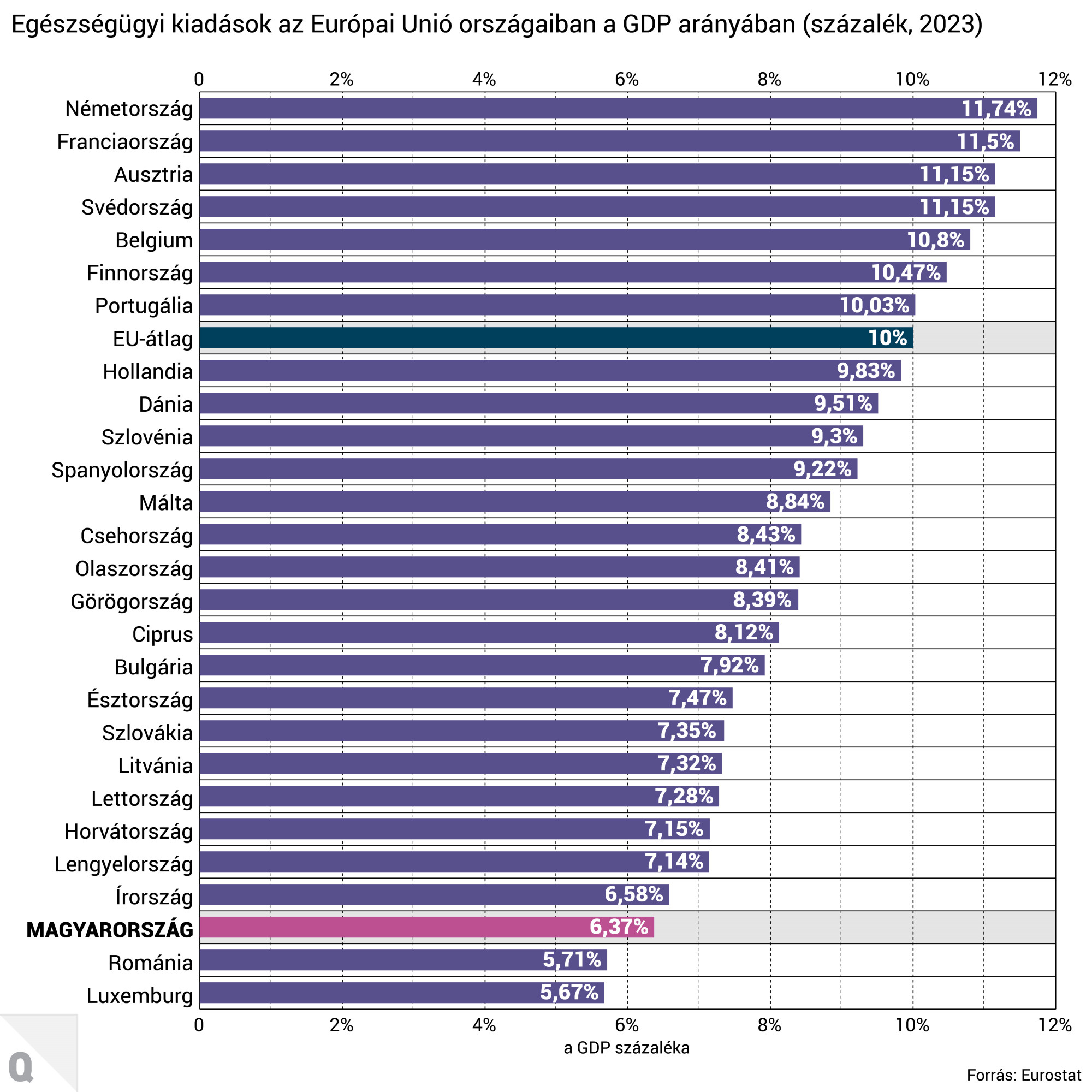 2023-ban az Európai Unió 1720 milliárd eurót költött egészségügyi kiadásokra, ami az EU GDP-jének 10 százalékát teszi ki, áll az Eurostat november közepén kiadott statisztikájában. Németországban volt a legmagasabb az aktuális egészségügyi kiadások szintje az EU-országok között, ami nem meglepő, hiszen ez a legnagyobb gazdasággal és a legnagyobb lakosságszámmal rendelkező EU-tagállam. Az viszont már beszédes, hogy a GDP-hez viszonyítva is Németországban volt a legmagasabb az egészségügyi kiadások aránya: a 2023-as egészségügyi kiadások a GDP 11,7 százalékát tették ki. A németeket követően a legmagasabb arányt Franciaország (11,5 százalék), Ausztria és Svédország (mindkettő 11,2 százalék) érte el. Ezzel szemben négy olyan EU-s ország van, ahol a folyó egészségügyi kiadások a GDP kevesebb mint 7,0 százalékát tették ki: Luxemburg, Románia (mindkettő 5,7 százalék), Magyarország (6,4 százalék) és Írország (6,6 százalék). Hozzá kell tenni ehhez azt is, hogy az idősödő népesség és az egyre fejlettebb technológiai megoldások miatt folyamatosan dráguló kezelések miatt Magyarországon ez az arány 2010-ben még 7,5 százalék volt. Azaz nem egyre jobban finanszírozzuk az egészségügyet, hanem egyre kevésbé.