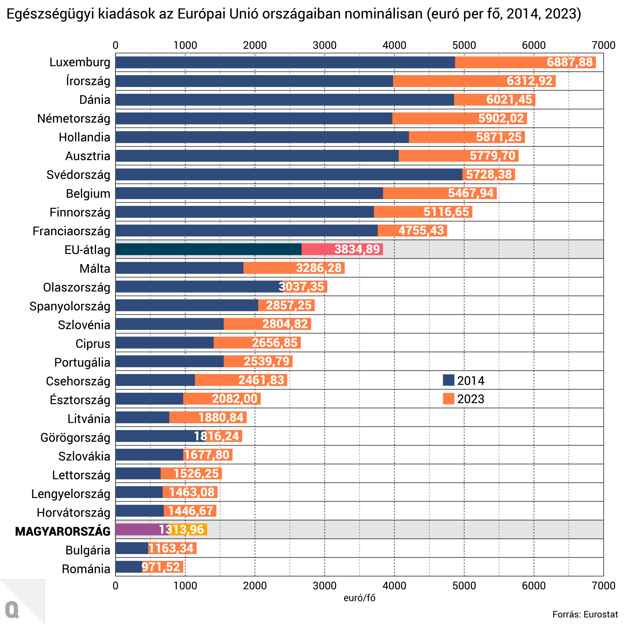Akkor sem fest jobban a kép, ha nem a nemzetgazdaság egészéhez képest vizsgáljuk a költéseket, hanem egy főre jutó összeg szempontjából. Az EU-ban az egészségügyi kiadások egy főre jutó összege a 2014-es 2668 euróról 2023-ra 3835 euróra emelkedett, ami látványos, 43,7 százalékos növekedést jelent. A tendencia minden egyes EU- tagállamban megfigyelhető volt, még Magyarországon is, csak a teljes gazdasághoz képest ez még így is csökkenő arányt jelent. Minden bizonnyal nem függetlenek az emelkedő költések attól sem, hogy az EU lakossága egyre idősödik, és ezzel együtt jár az egészségügyi rendszerek növekvő igénybevétele.