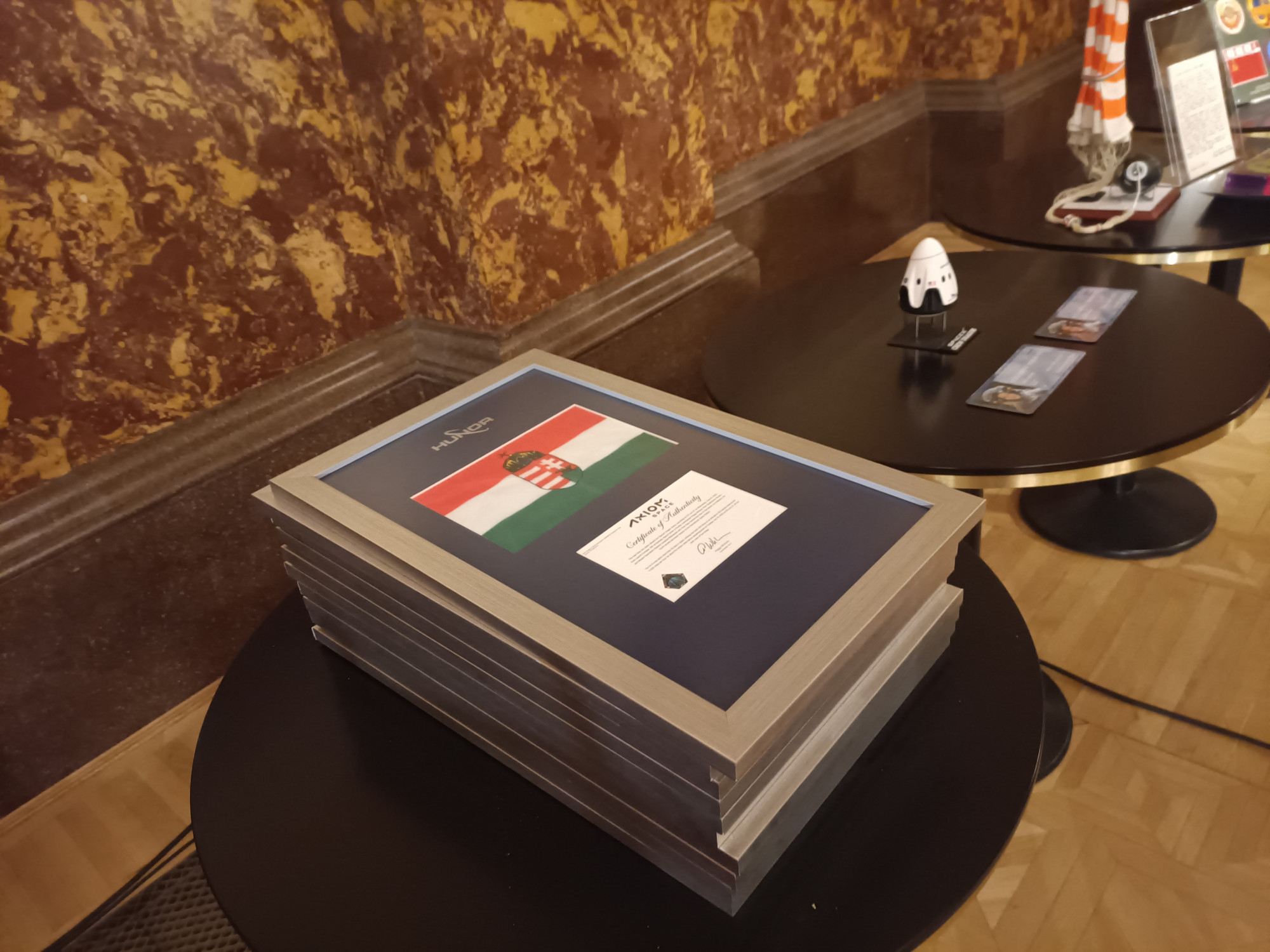 A zászlókat egy nagy méretű keretbe foglalták, amin az Axiom Space hitelesítése is látható, ami szerint ezek nem akármilyen lobogók, hanem űrben jártak (Kapu mutatott egy képet is, amin a kezében van a lobogó – szóval a történet nem áll olyan gyenge lábakon, mint egyesek szerint az amerikaiak Holdra szállása). Az első zászlót Schuminszky kapta meg, majd jöttek a többiek: Vincze Miklós az ELTE Fizika Tanszékéről, Budapest 16. kerülete, Kistarcsa, a Magyari Béla Emlékkiállításnak is otthont adó Kiskun Múzeum, a Magyar Asztronautikai Társaság, a Magyar Nemzeti Múzeum, maga Kapu Tibor, Farkas Bertalan és Cserényi Gyula – utóbbiak viszont nem tudtak eljönni az ünnepségre, a lobogót majd később kapják meg.