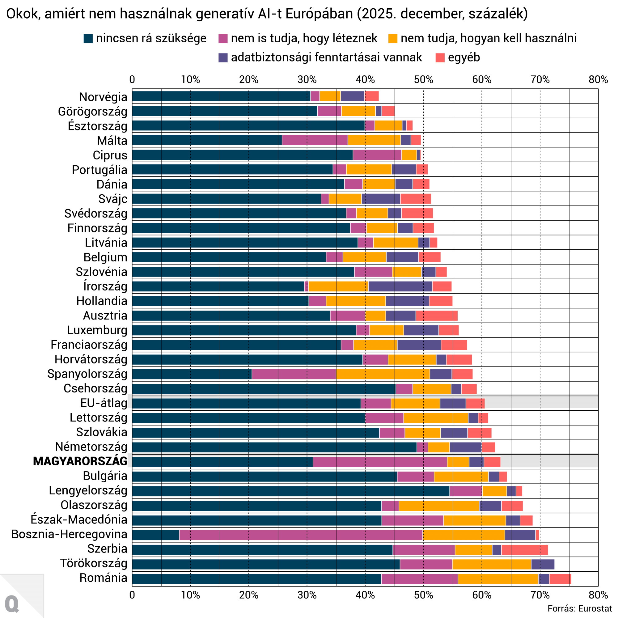 A mesterségesintelligencia-használat Romániában, Olaszországban és Bulgáriában volt a legalacsonyabb. Ezeket az országokat Magyarország sem hagyta le sokkal – ezzel az uniós átlaghoz közeli arányokat ért el – ugyanis itt az emberek közel 30 százaléka használta az AI-eszközöket valamilyen céllal. Ugyanakkor az európaiak több mint kétharmada nem használta idén az AI-t, aminek a leggyakoribb oka az volt, hogy az érintettek nem érezték ennek szükségét. A válaszok között felmerültek olyan indokok is, hogy a megkérdezettek nem tudták használni ezeket az eszközöket, vagy nem is tudtak a létezésükről, és nagyon kis arányban az adatvédelmi aggályok miatt mellőzték az AI használatát.