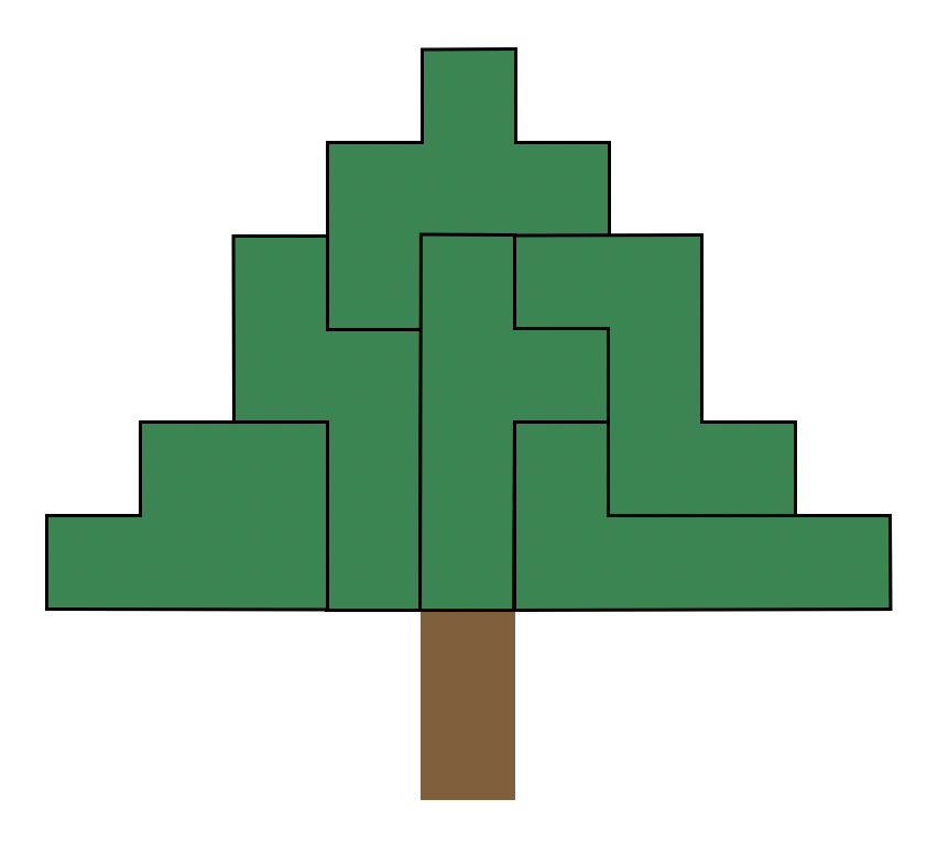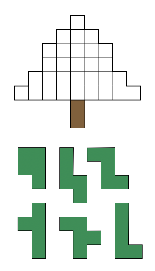 Hogyan lehet az alábbi fenyőfa koronáját hézagmentesen kirakni a fenyő alatti hat darab pentominó elem segítségével? Mindegyik elem öt kis négyzetből áll, és át szabad őket fordítani a másik oldalukra, azaz tükrözhetők!